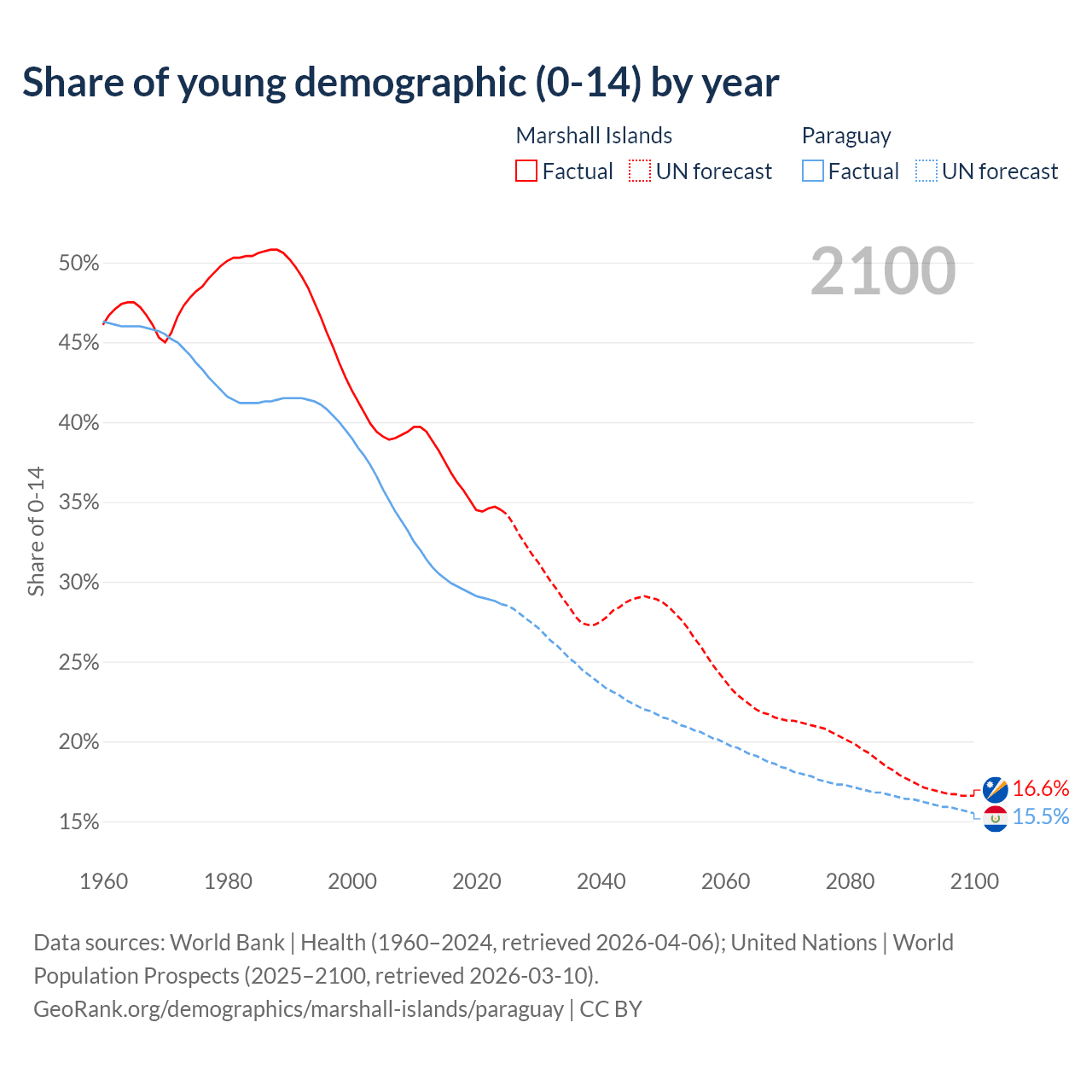 - The share of young demographic (0-15 years old) in the Marshall Islands is 34.5% vs 28.6% in Paraguay.