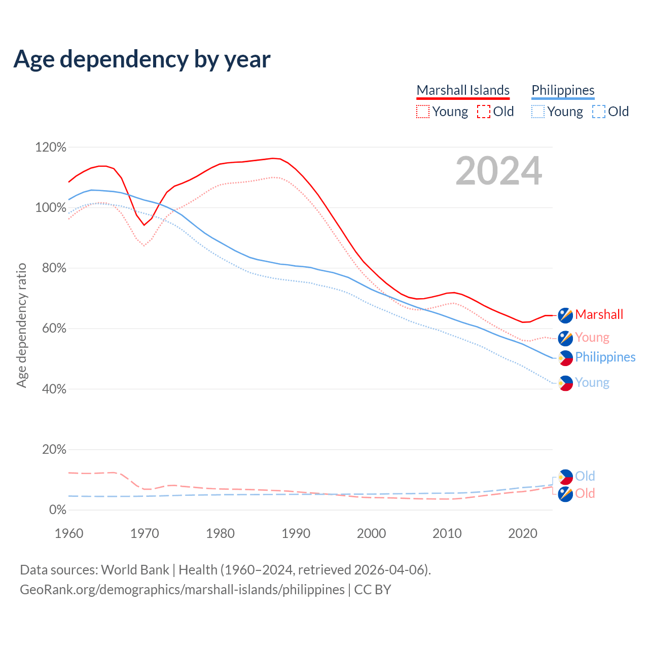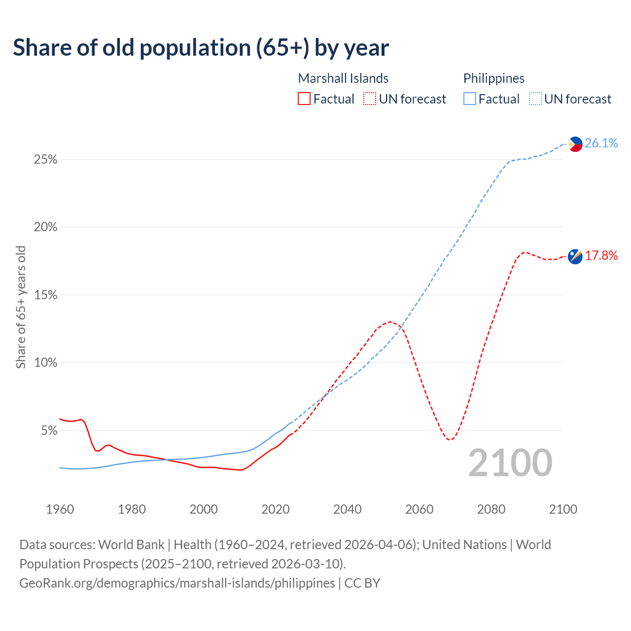 - The share of old-age demographic (65+) in the Marshall Islands is 4.64% vs 5.49% in the Philippines.
