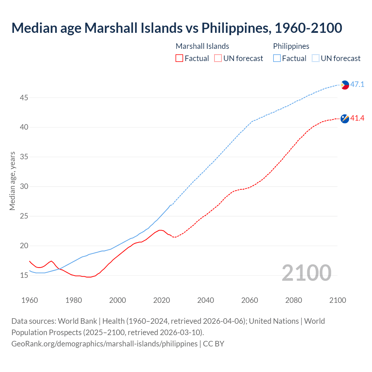 - The Marshall Islands is ranked 150/196 by median age (oldest to youngest) vs 123/196 for the Philippines.