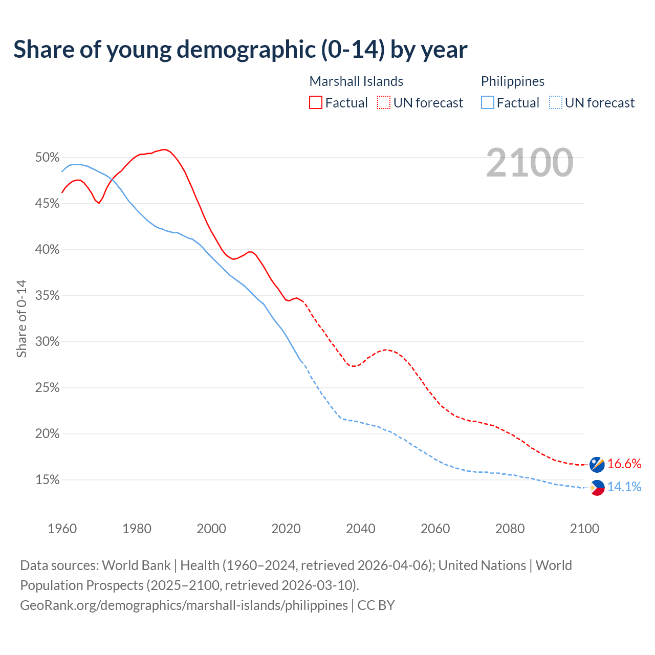 - The share of young demographic (0-15 years old) in the Marshall Islands is 34.5% vs 27.9% in the Philippines.