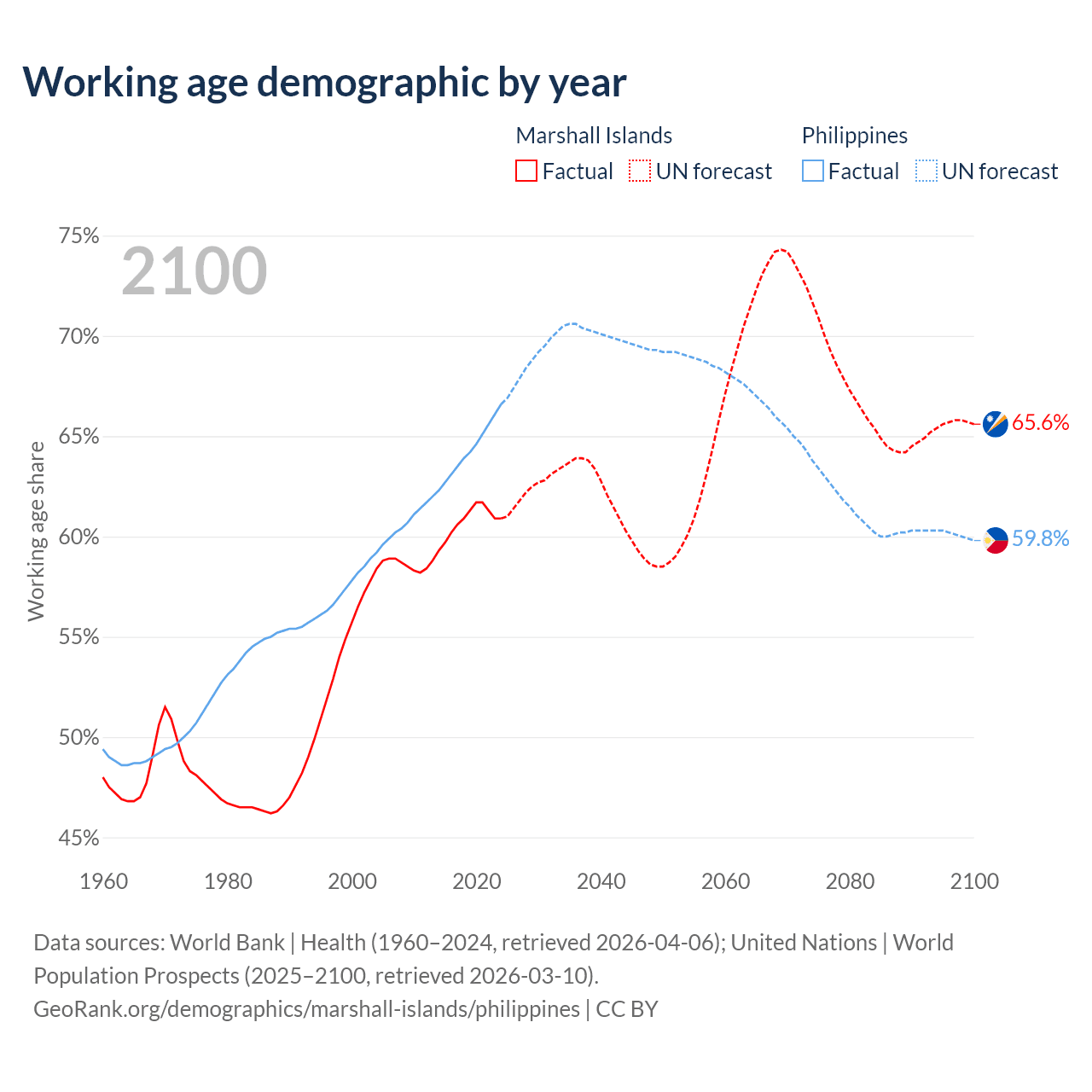 - The Marshall Islands has 21.3K working age adults (aged 15-64) vs 78.6M in the Philippines.