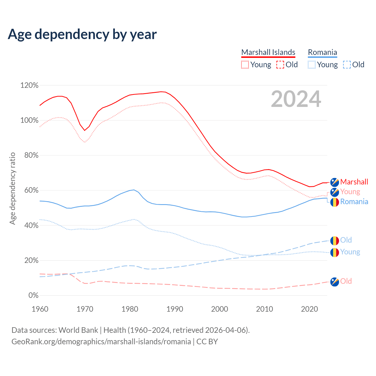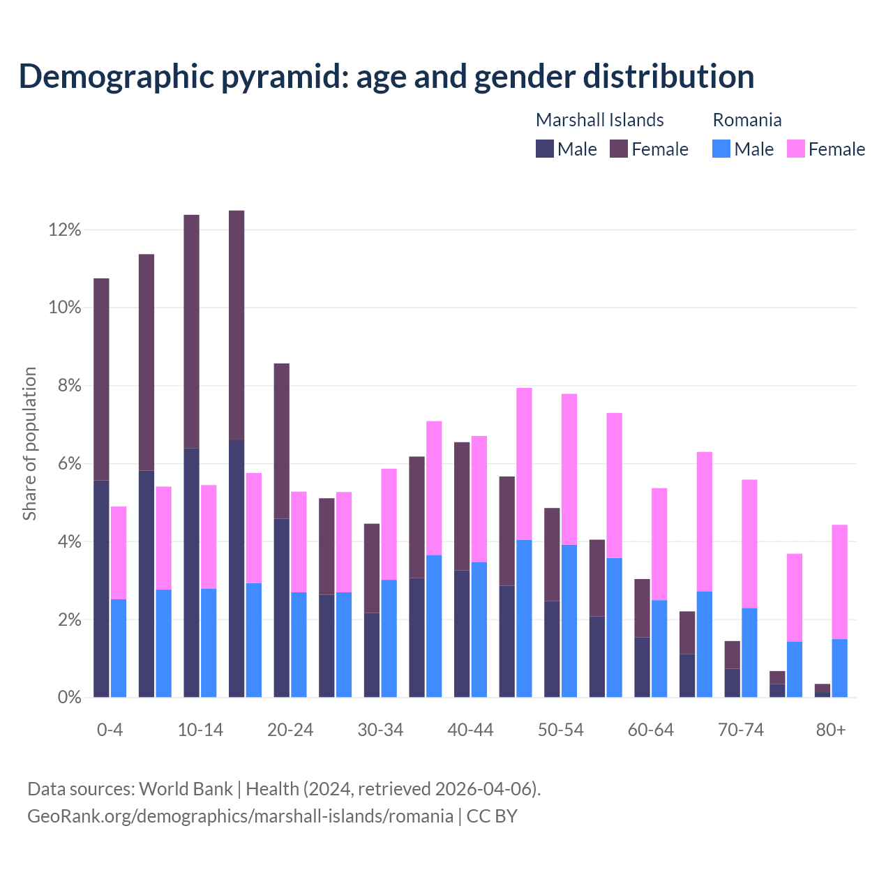 - The share of old-age demographic (65+) in the Marshall Islands is 4.64% vs 20% in Romania.