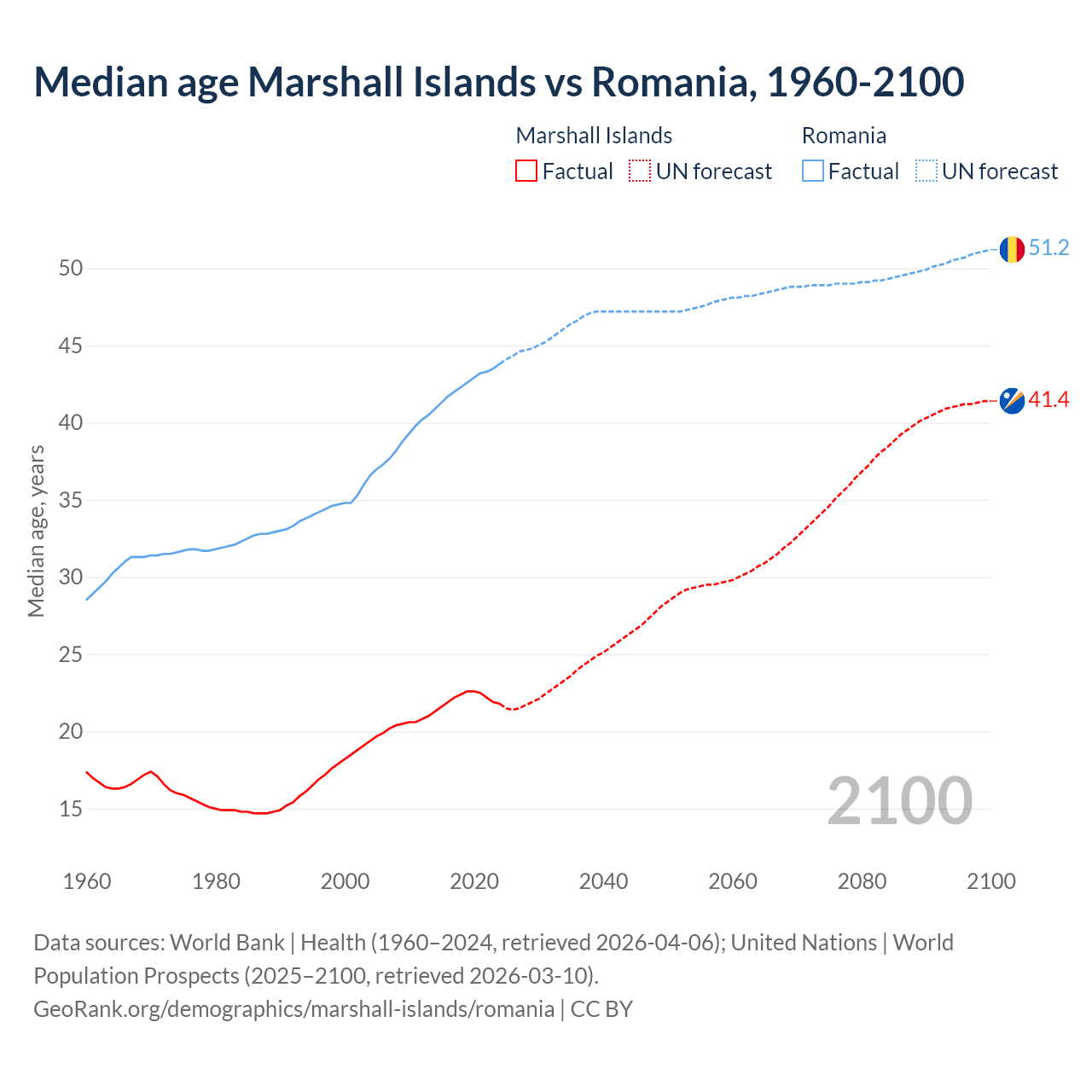 Median age Marshall Islands vs Romania, 1960-2100