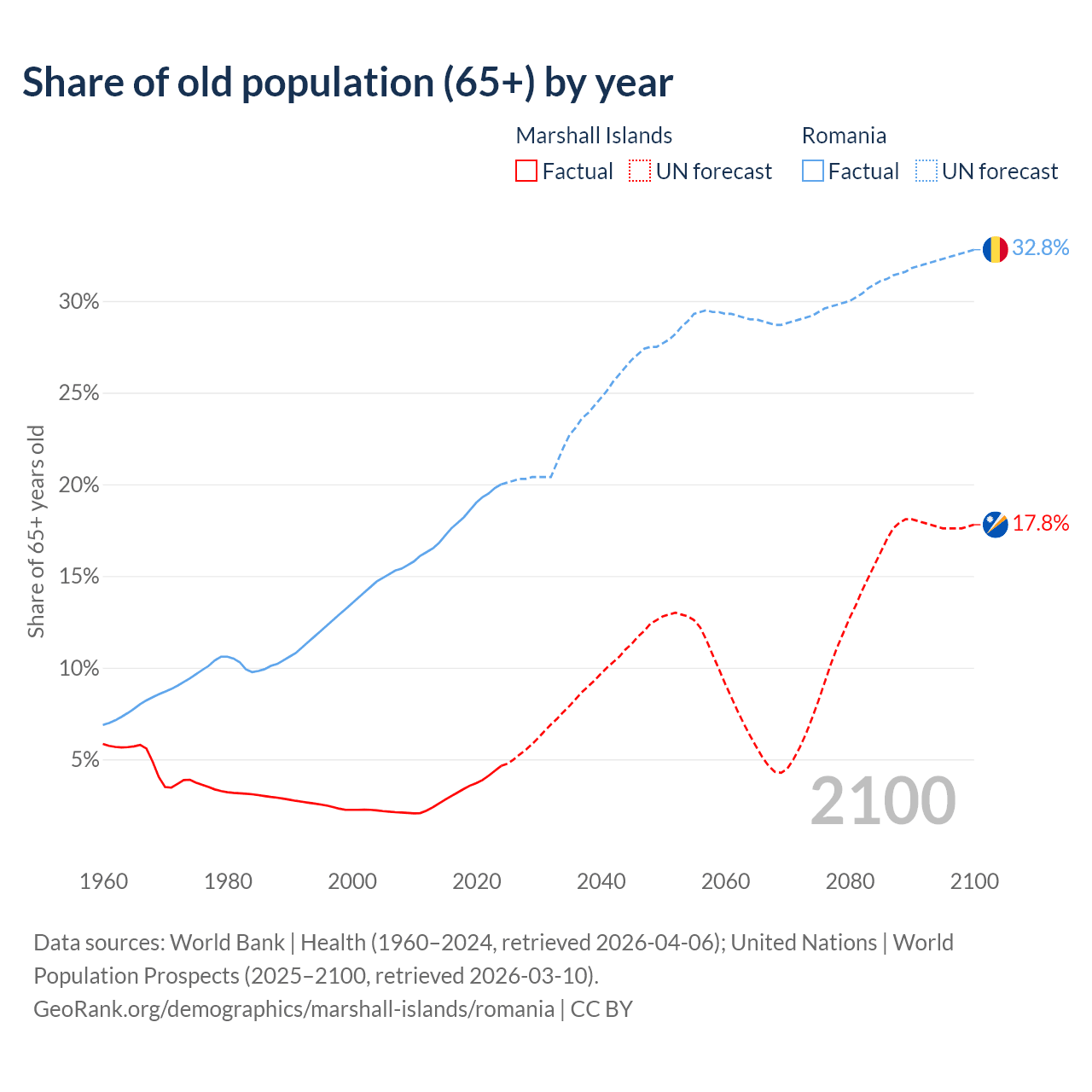The share of older people aged 65 and over is 4.64% in the Marshall Islands and 20% in Romania. Life expectancy in the Marshall Islands compared to Romania .