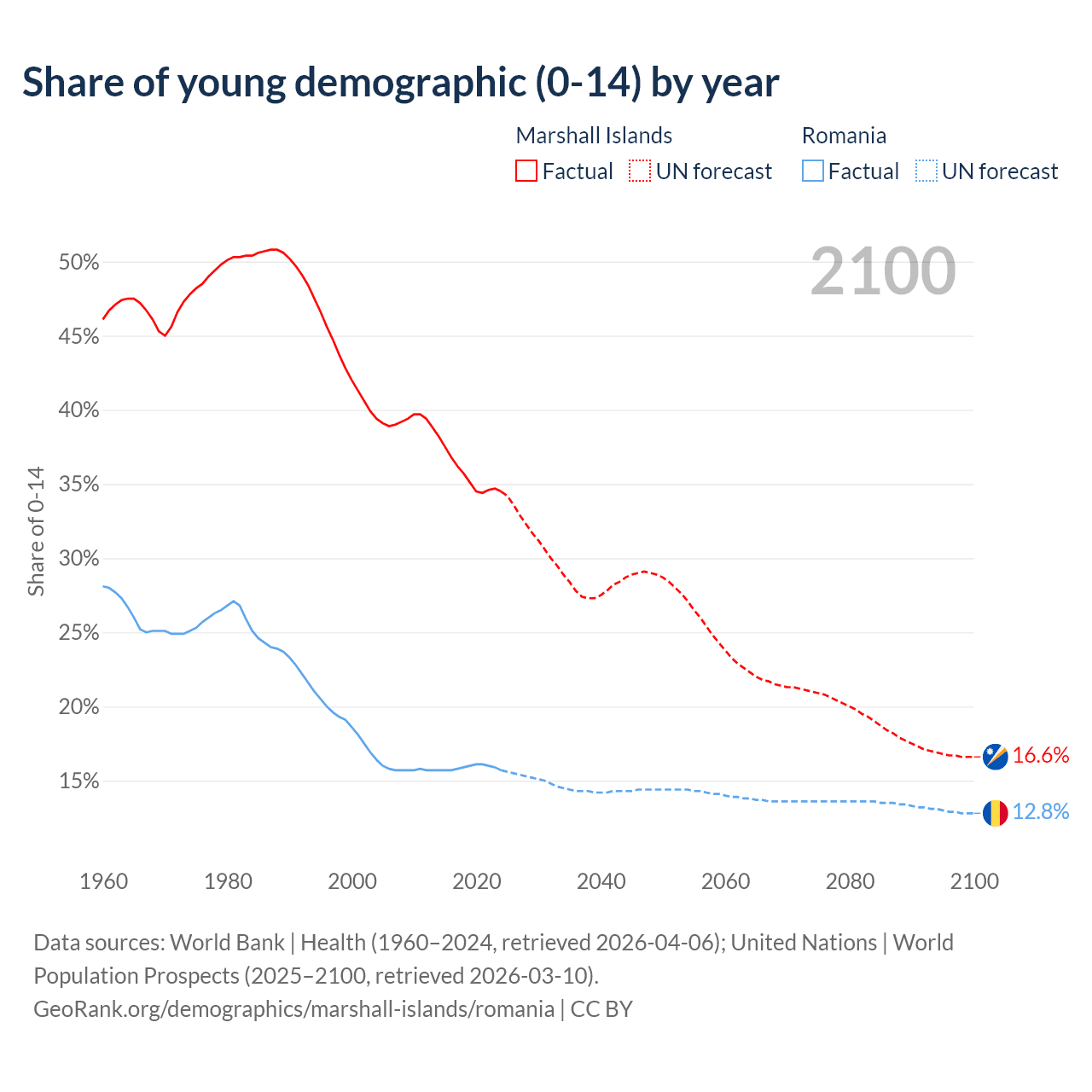 - The share of young demographic (0-15 years old) in the Marshall Islands is 34.5% vs 15.7% in Romania.