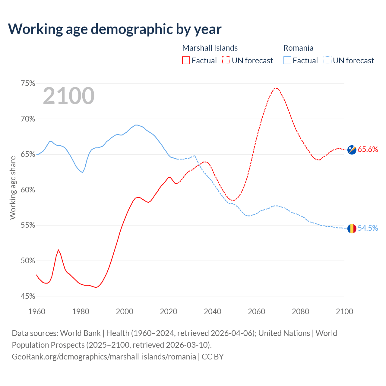 - The Marshall Islands has 21.3K working age adults (aged 15-64) vs 12.1M in Romania.