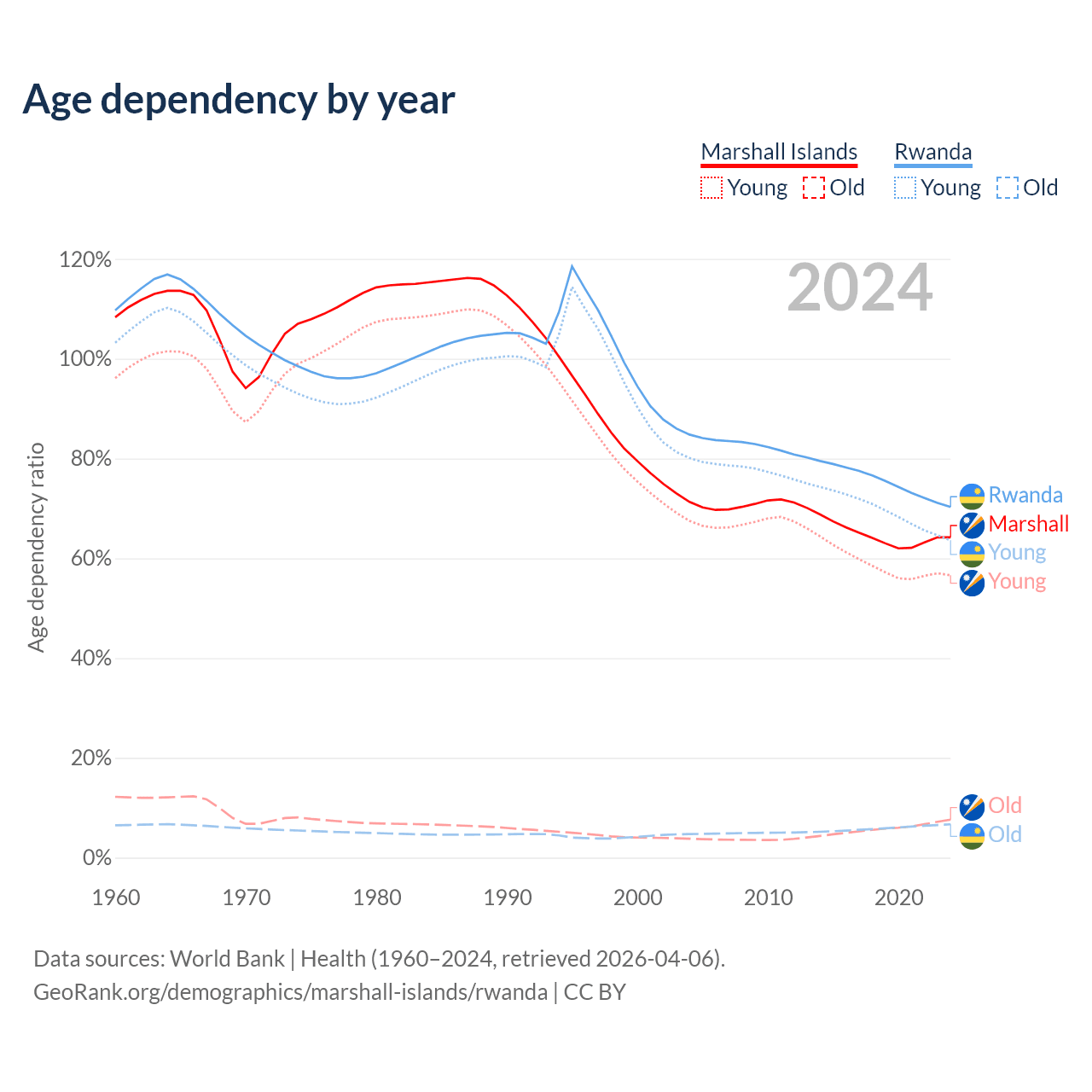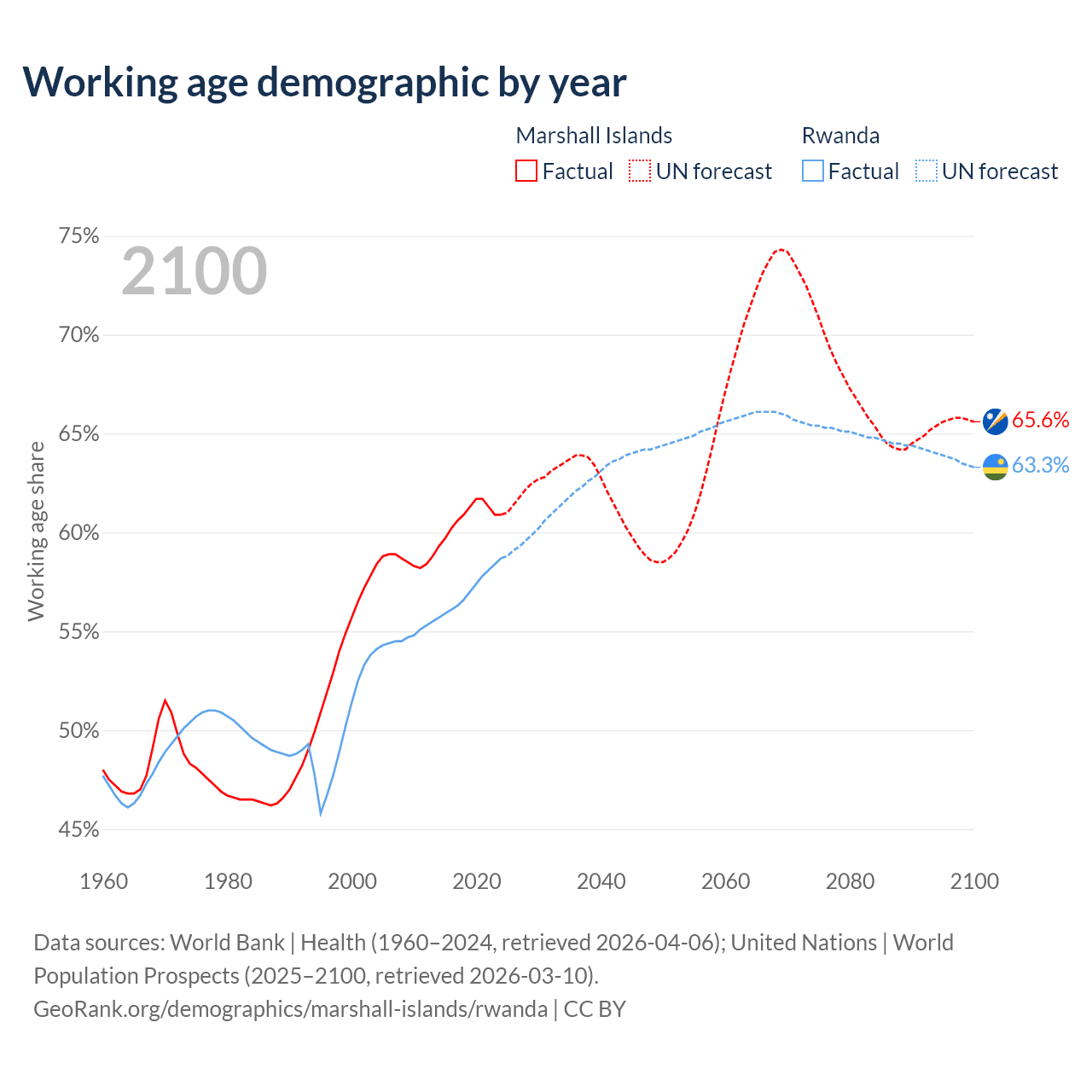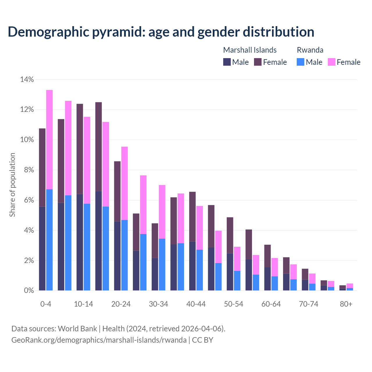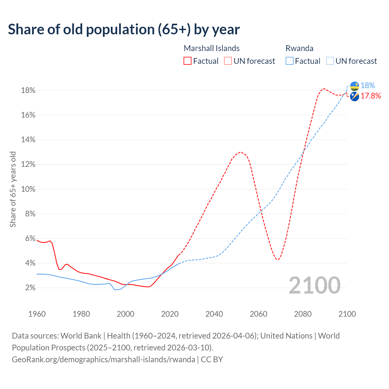 - The share of old-age demographic (65+) in the Marshall Islands is 4.64% vs 3.93% in Rwanda.