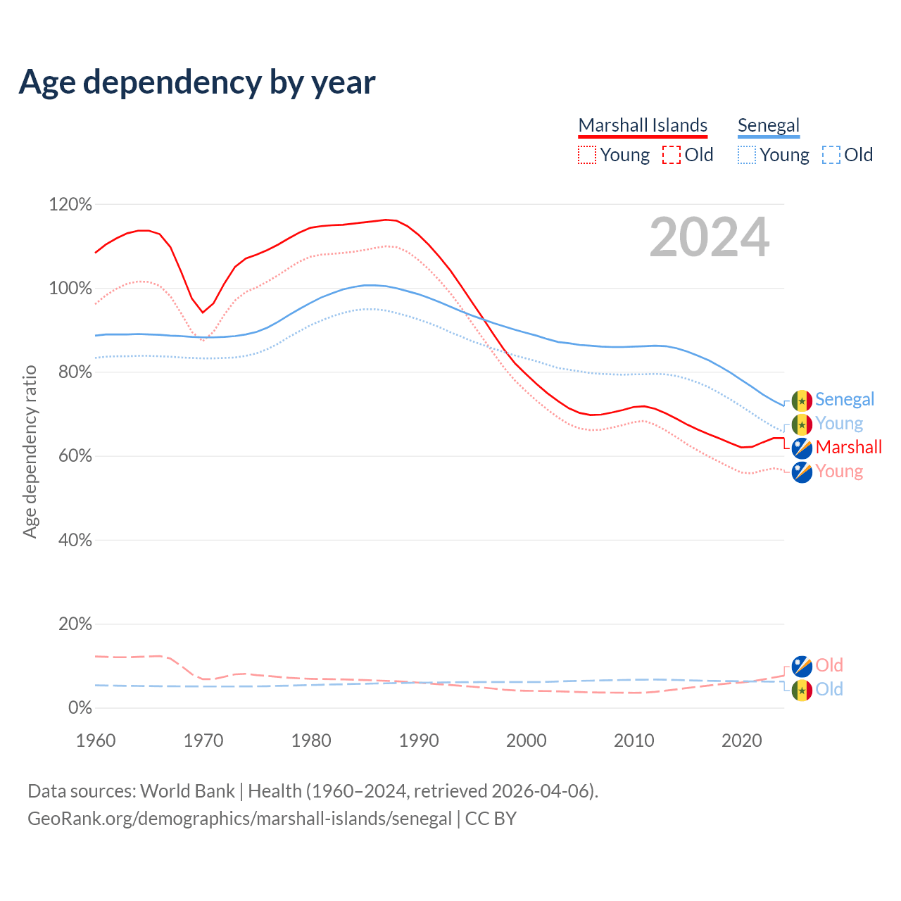 - The share of old-age demographic (65+) in the Marshall Islands is 4.64% vs 3.62% in Senegal.