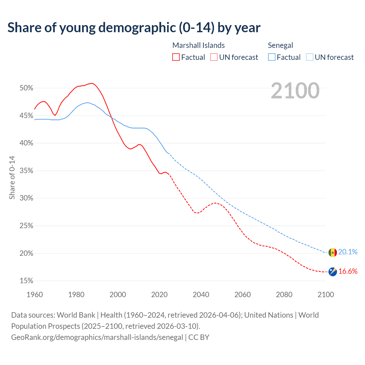 - The share of young demographic (0-15 years old) in the Marshall Islands is 34.5% vs 38.2% in Senegal.
