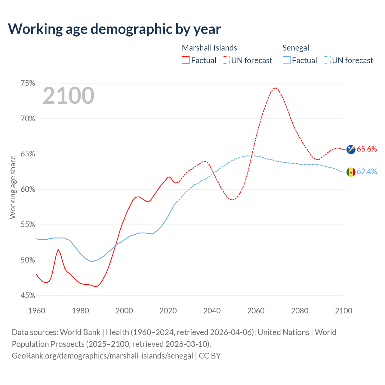 - The Marshall Islands has 21.3K working age adults (aged 15-64) vs 11.3M in Senegal.