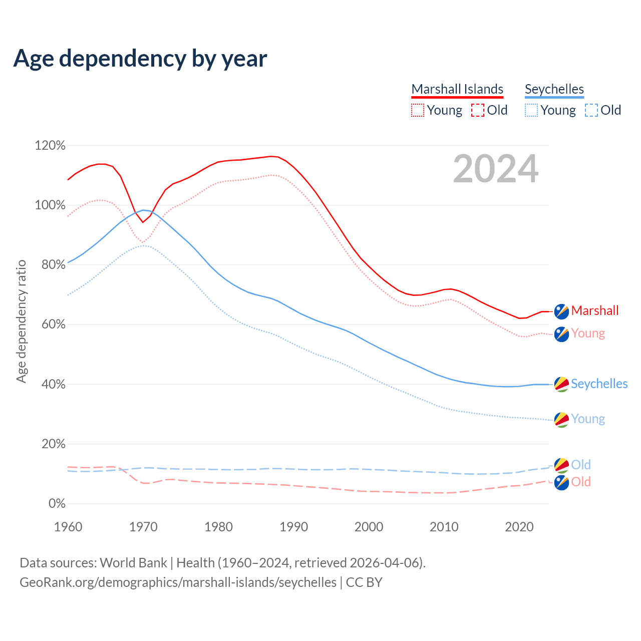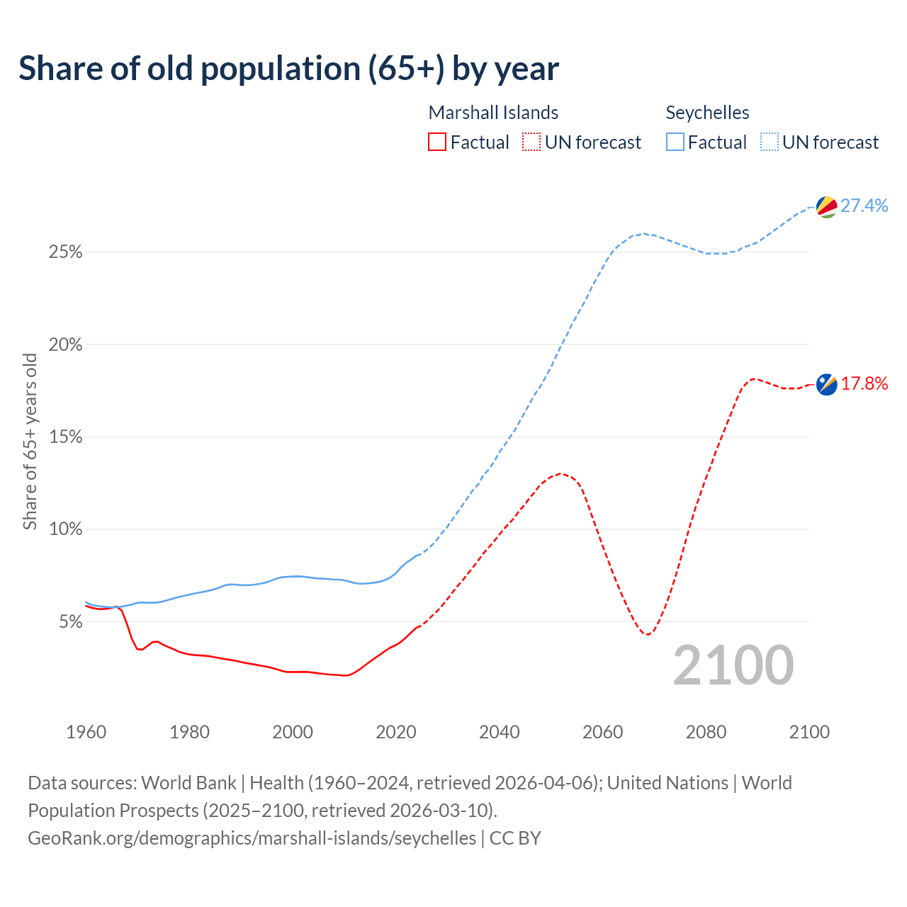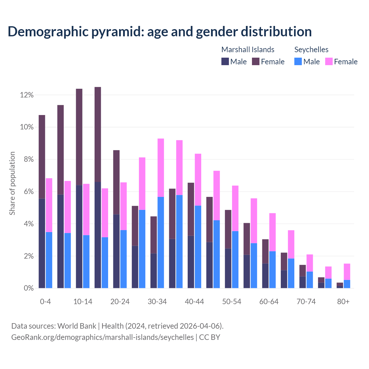 - The share of old-age demographic (65+) in the Marshall Islands is 4.64% vs 8.54% in the Seychelles.