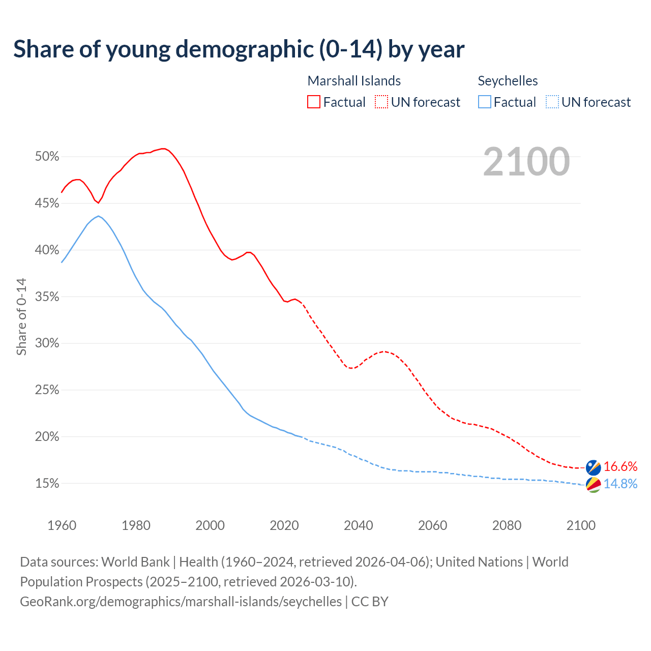 - The share of young demographic (0-15 years old) in the Marshall Islands is 34.5% vs 20% in the Seychelles.