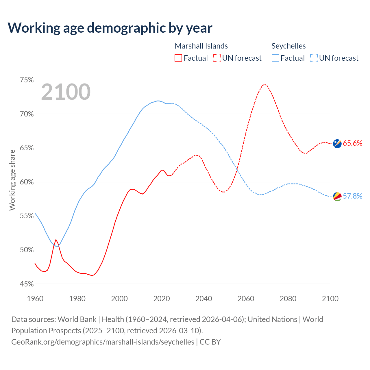 - The Marshall Islands has 21.3K working age adults (aged 15-64) vs 90.3K in the Seychelles.