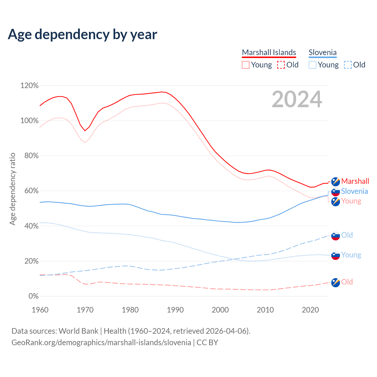 - The share of old-age demographic (65+) in the Marshall Islands is 4.64% vs 21.8% in Slovenia.