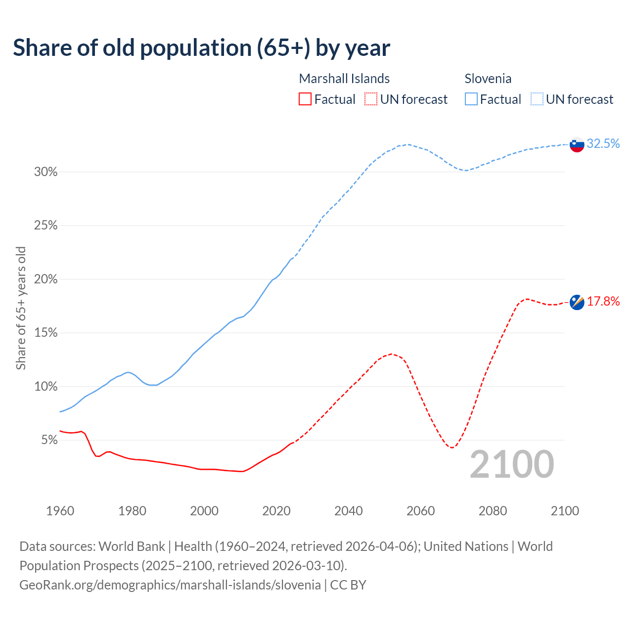 The share of older people aged 65 and over is 4.64% in the Marshall Islands and 21.8% in Slovenia. Life expectancy in the Marshall Islands compared to Slovenia .