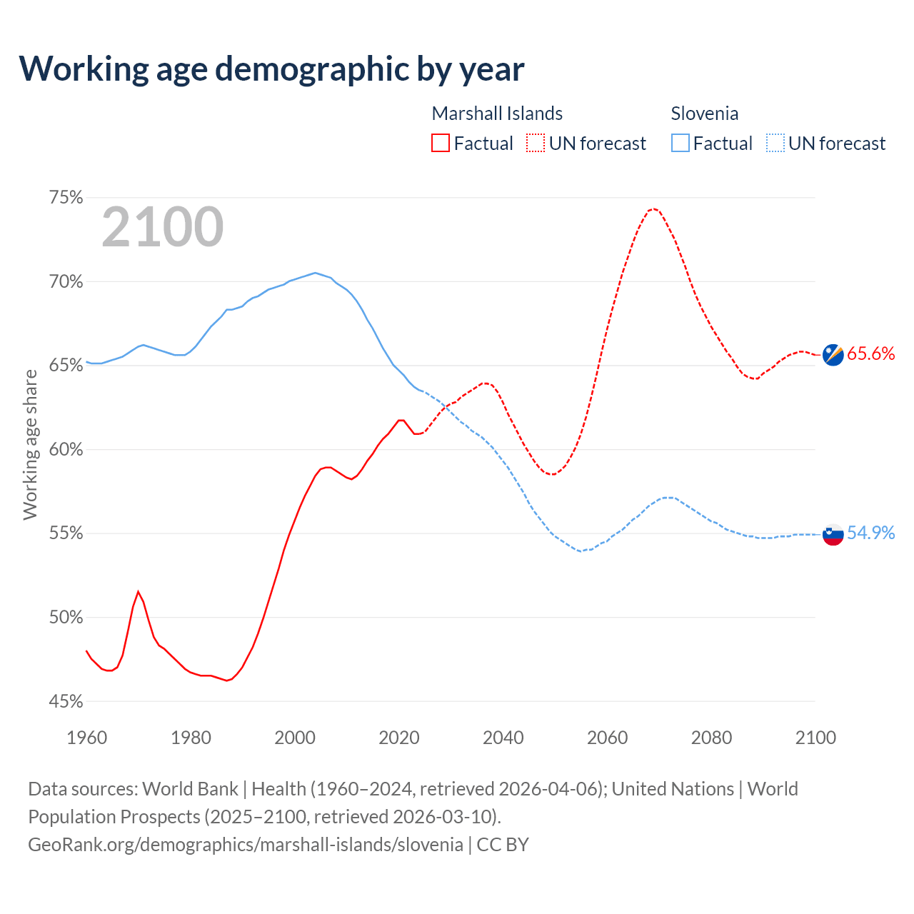 Median age Marshall Islands vs Slovenia, 1960-2100