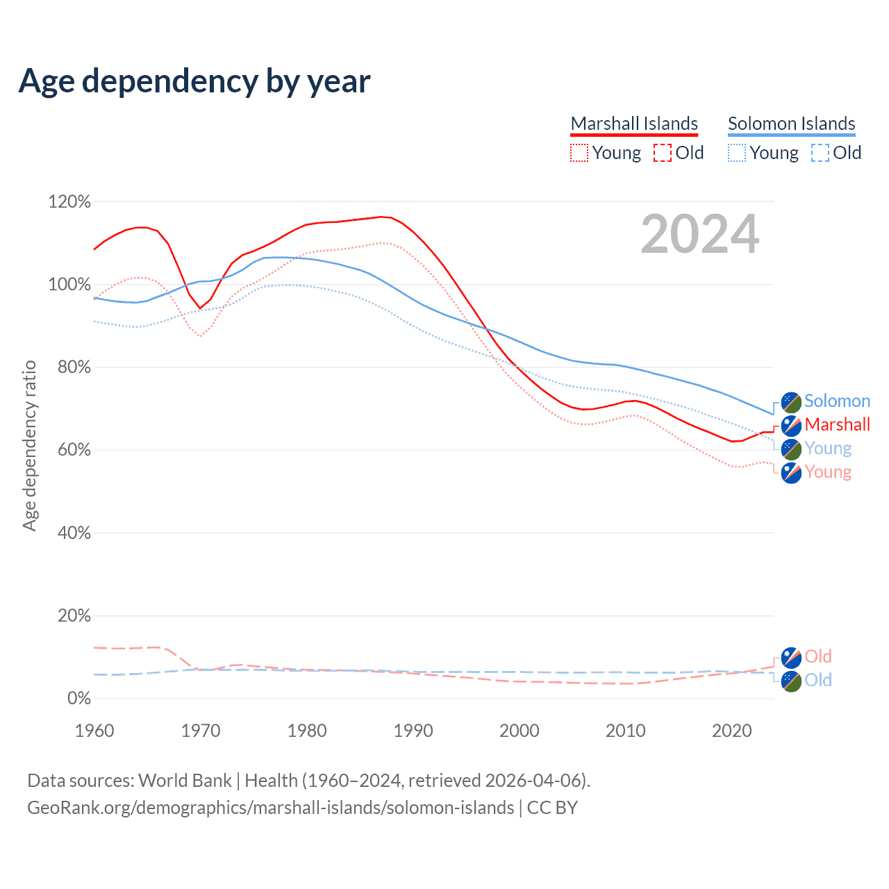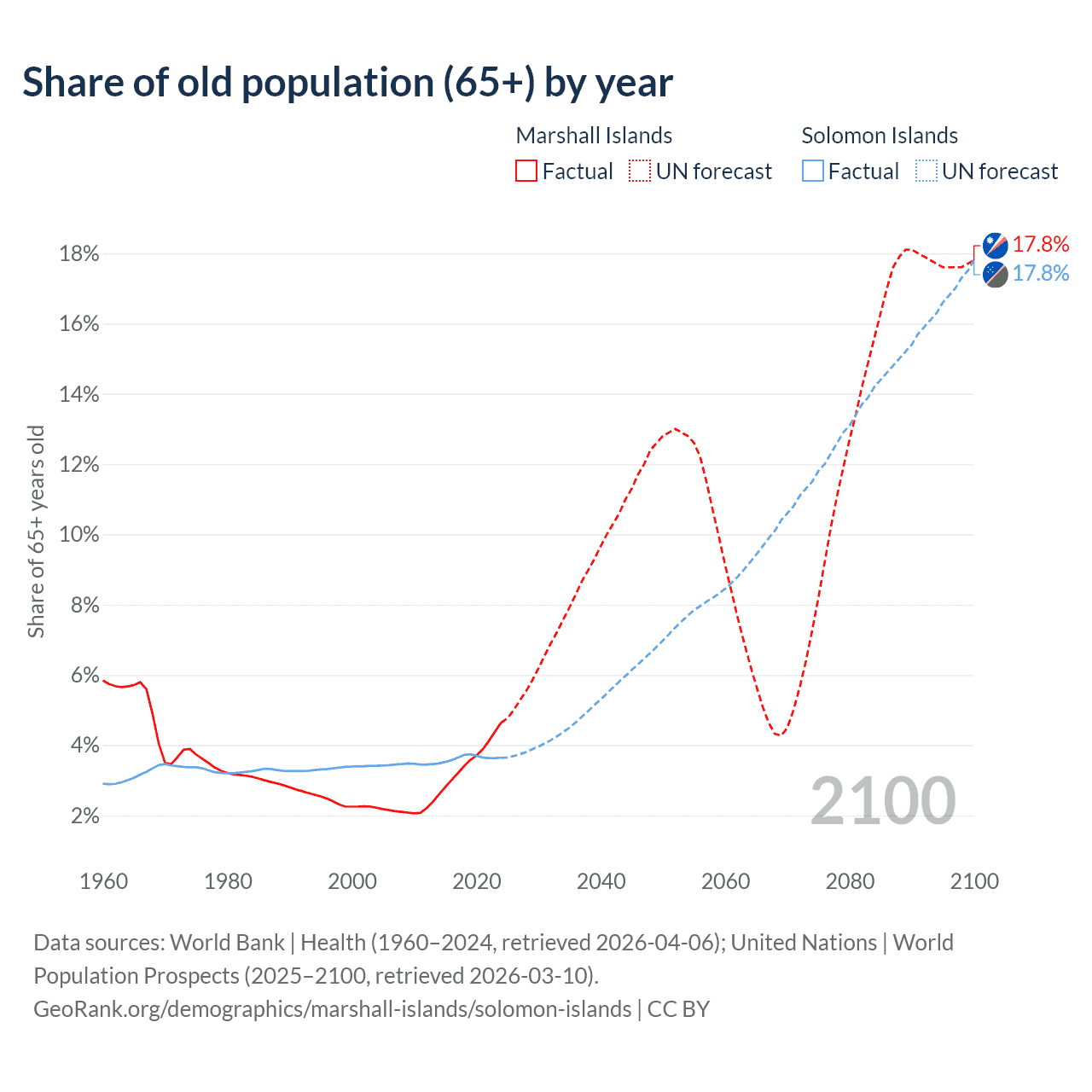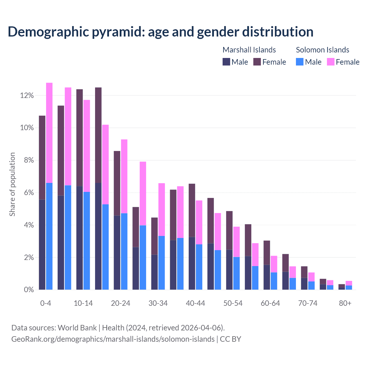- The share of old-age demographic (65+) in the Marshall Islands is 4.64% vs 3.64% in the Solomon Islands.