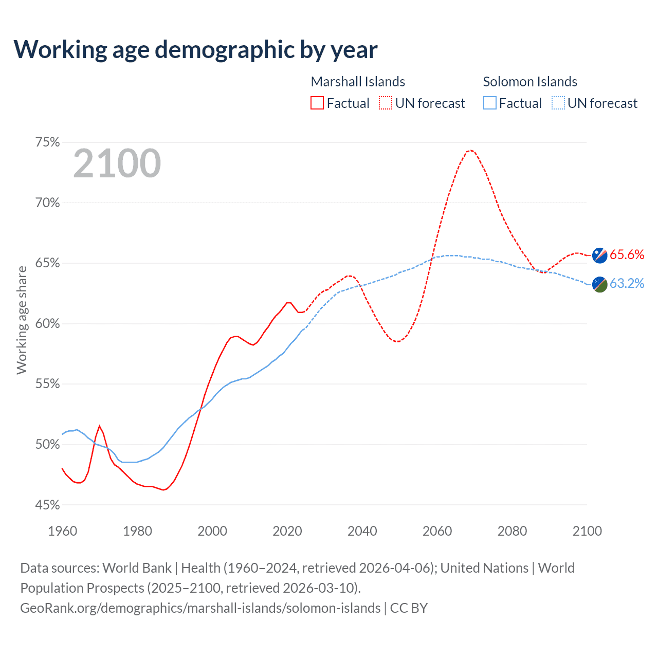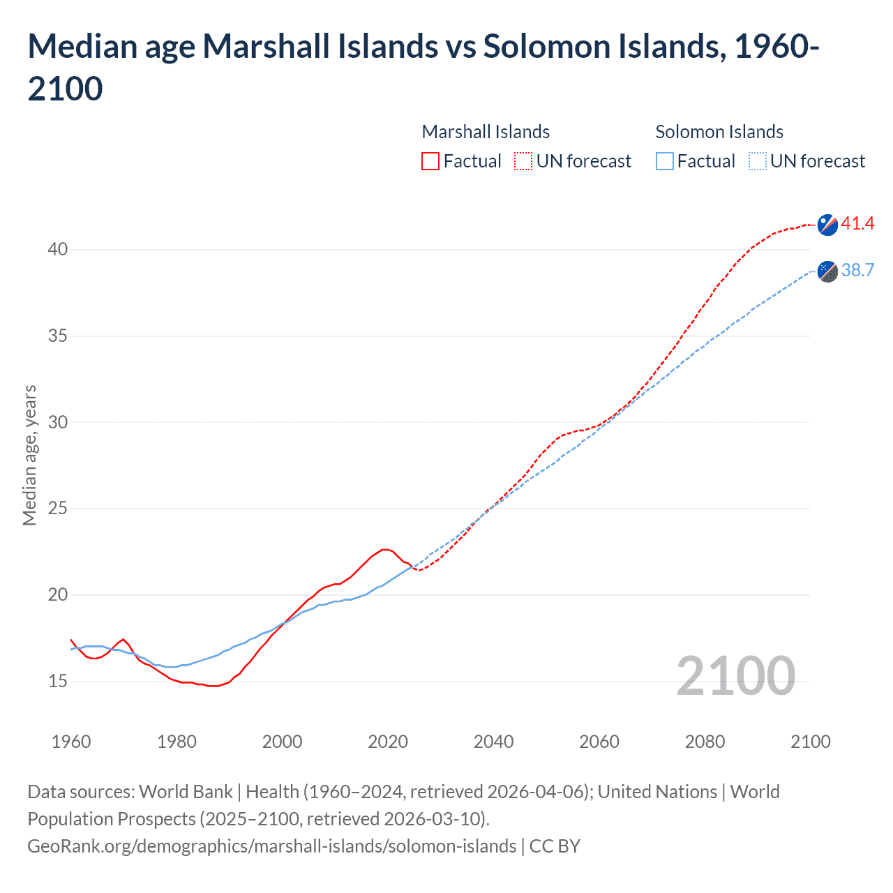 Median age Marshall Islands vs Solomon Islands, 1960-2100