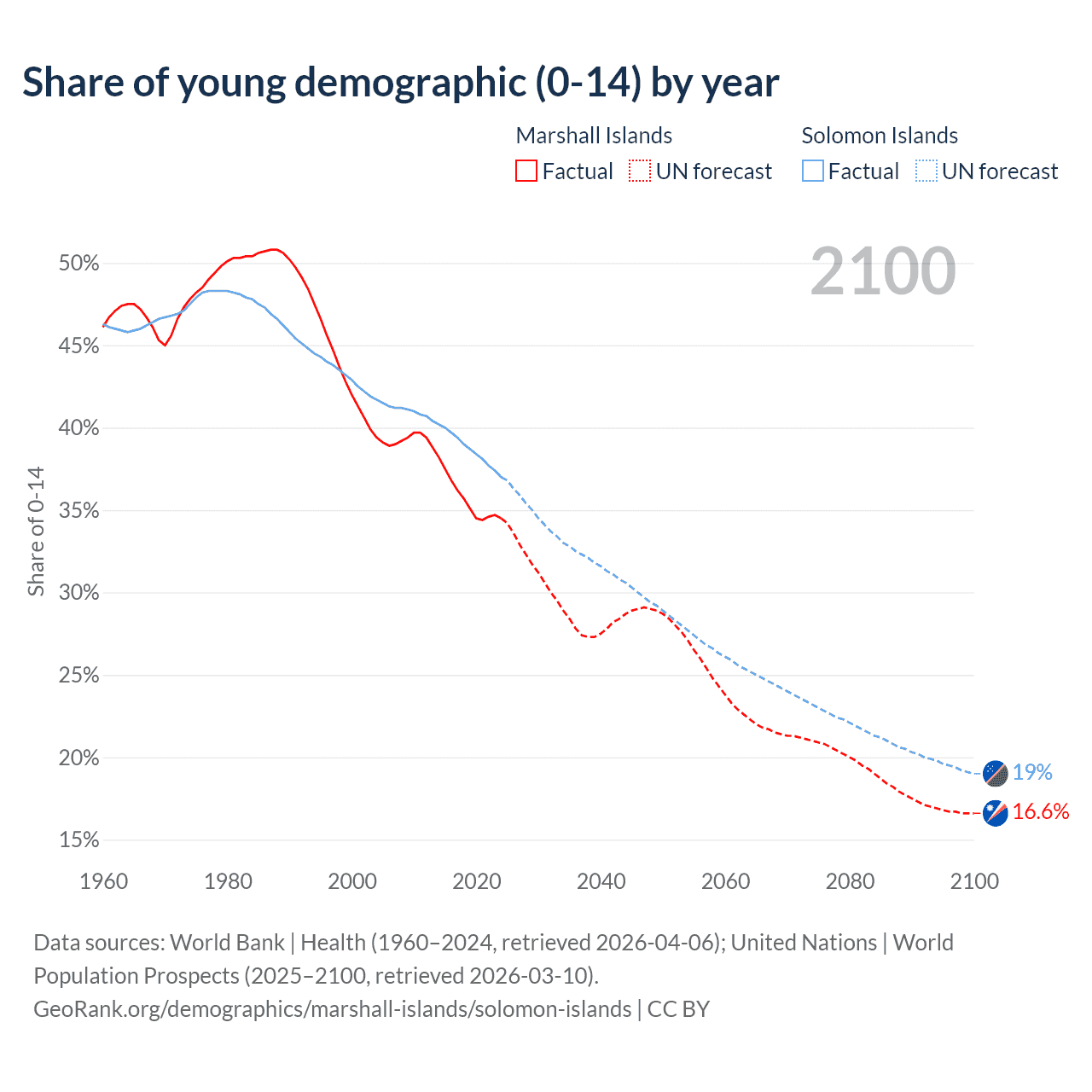 - The share of young demographic (0-15 years old) in the Marshall Islands is 34.5% vs 37% in the Solomon Islands.