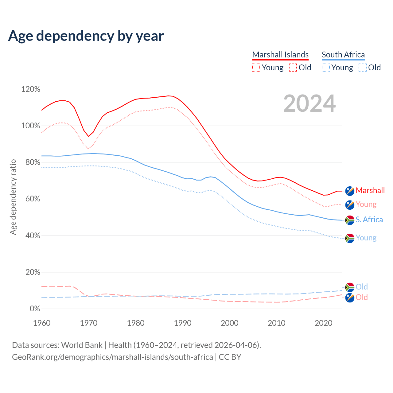 - The share of old-age demographic (65+) in the Marshall Islands is 4.64% vs 6.69% in South Africa.