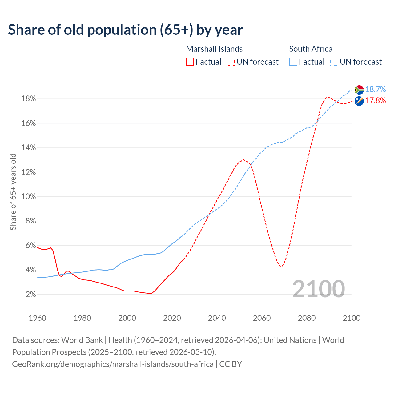 The share of older people aged 65 and over is 4.64% in the Marshall Islands and 6.69% in South Africa. Life expectancy in the Marshall Islands compared to South Africa .