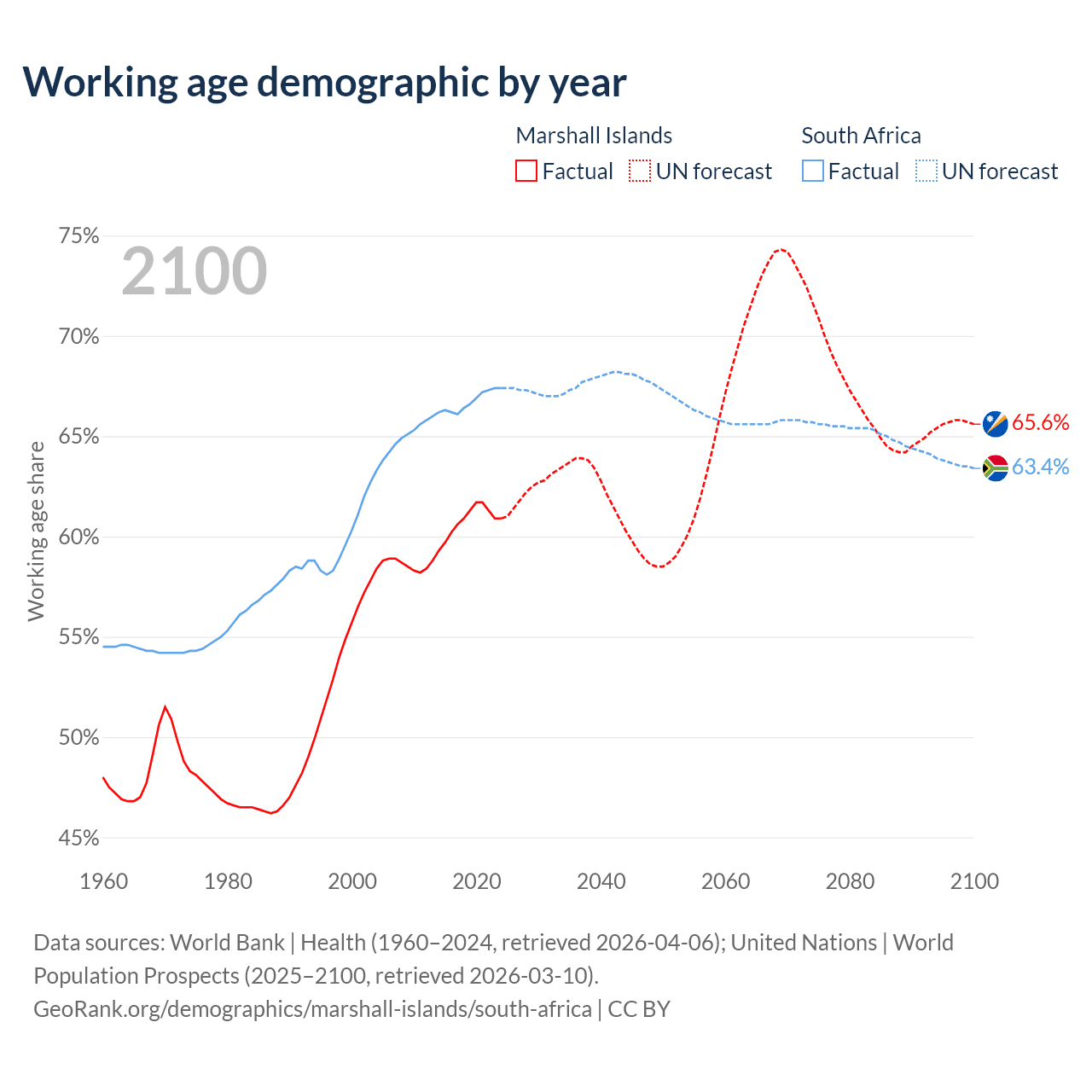 Median age Marshall Islands vs South Africa, 1960-2100