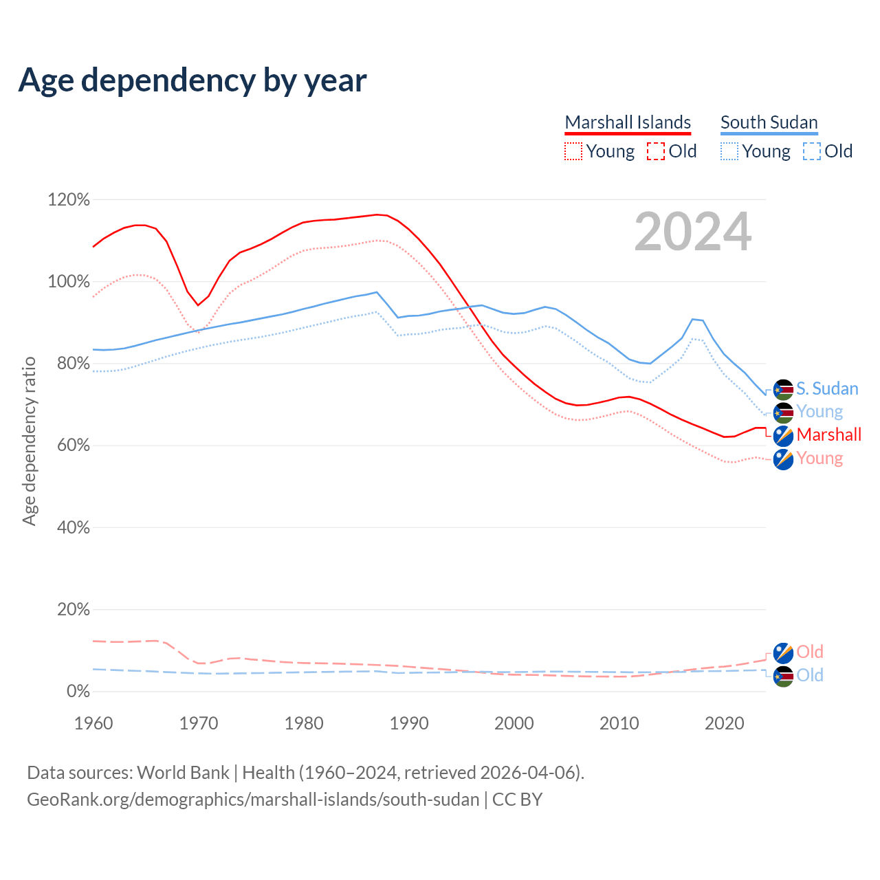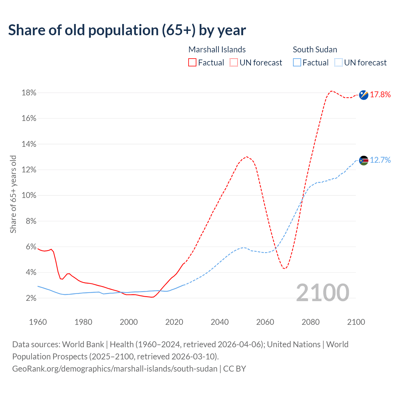 - The share of old-age demographic (65+) in the Marshall Islands is 4.64% vs 2.99% in South Sudan.