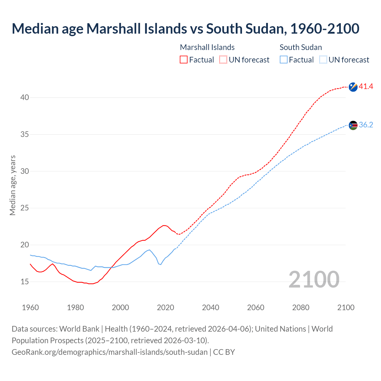 Median age Marshall Islands vs South Sudan, 1960-2100