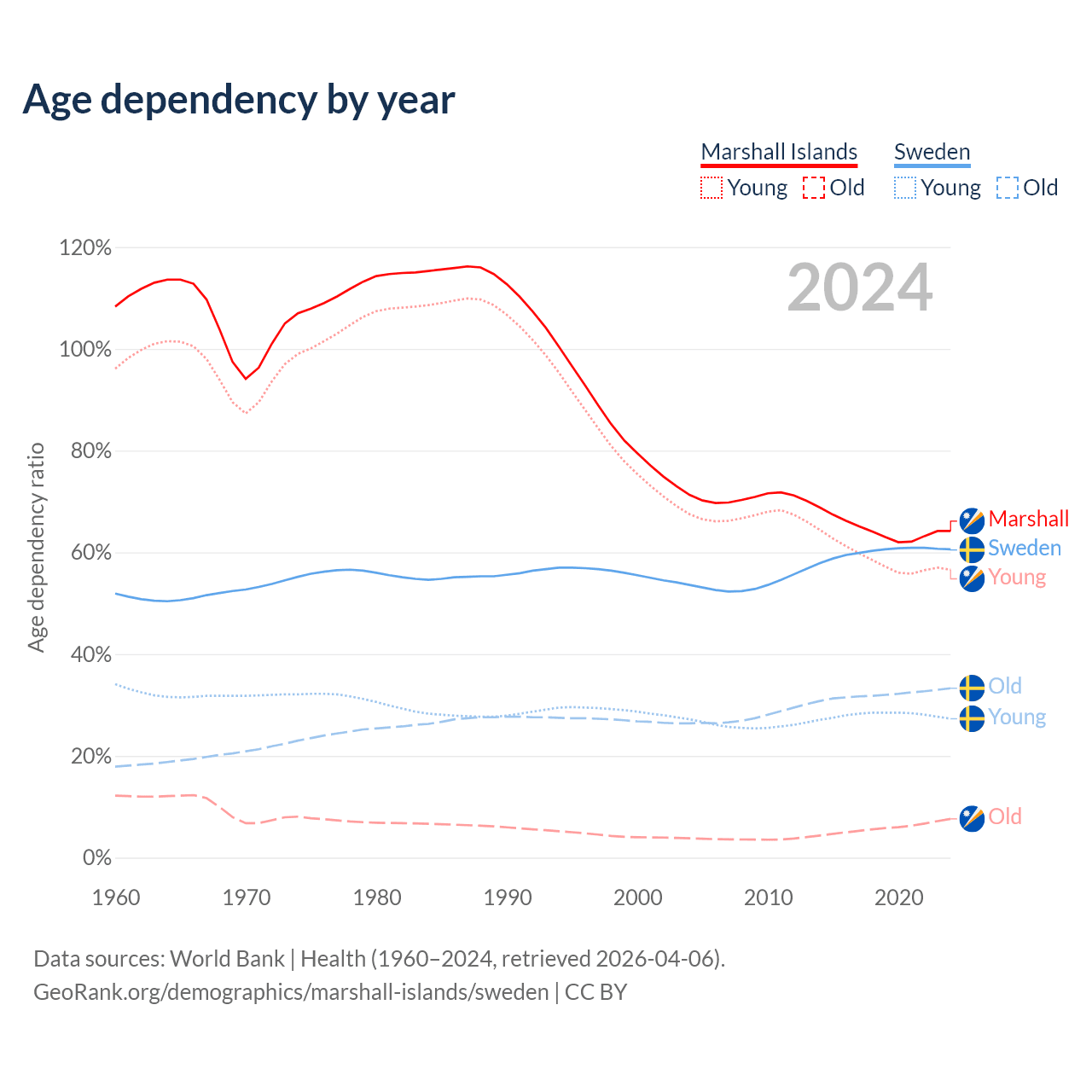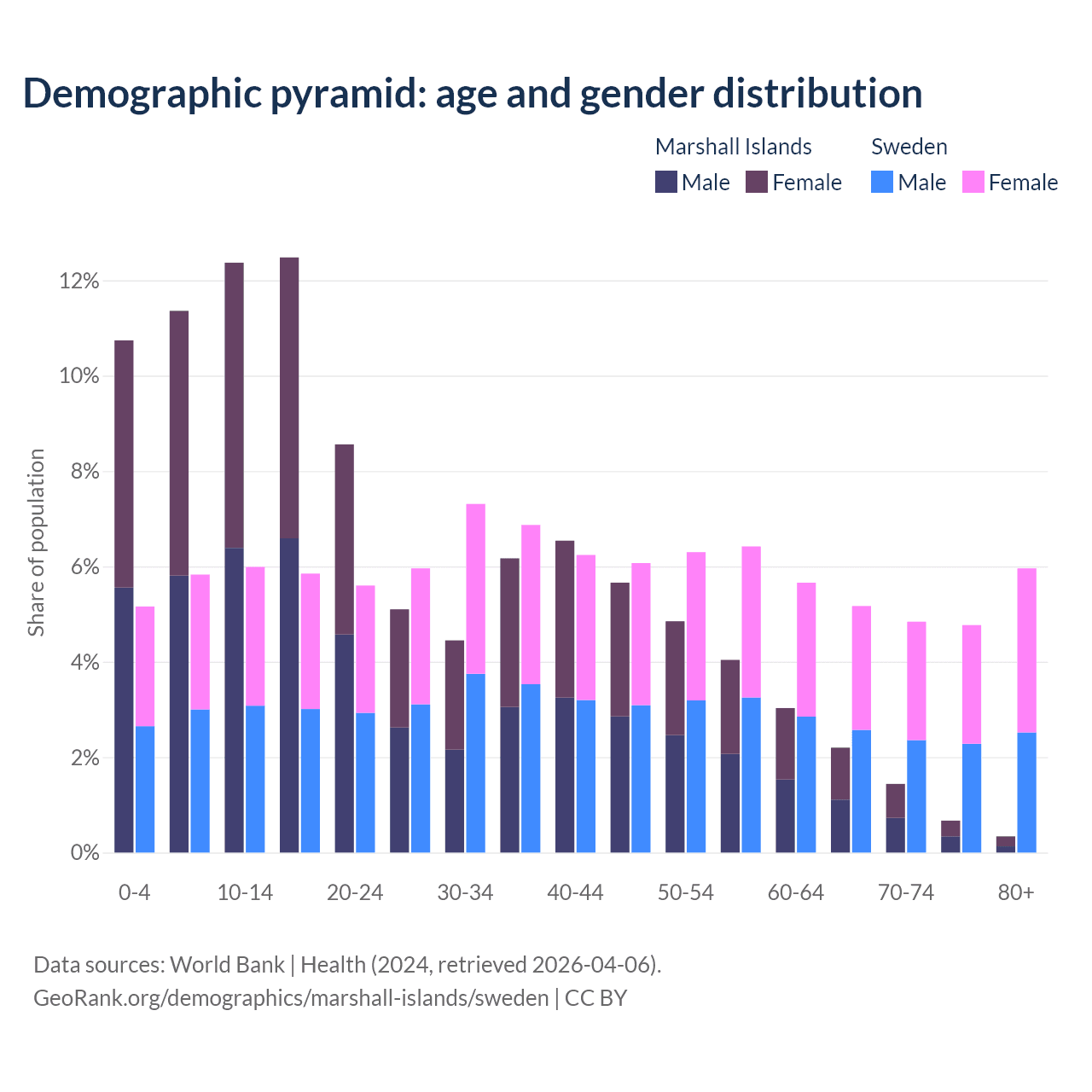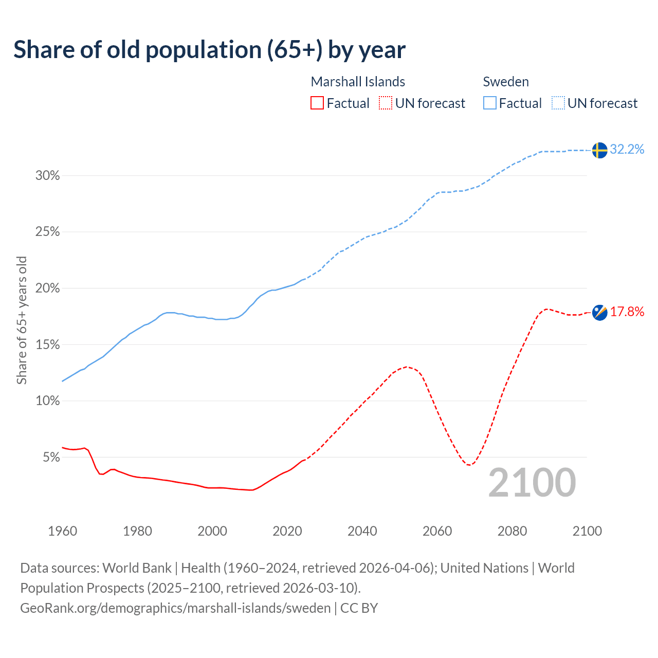 - The share of old-age demographic (65+) in the Marshall Islands is 4.64% vs 20.7% in Sweden.