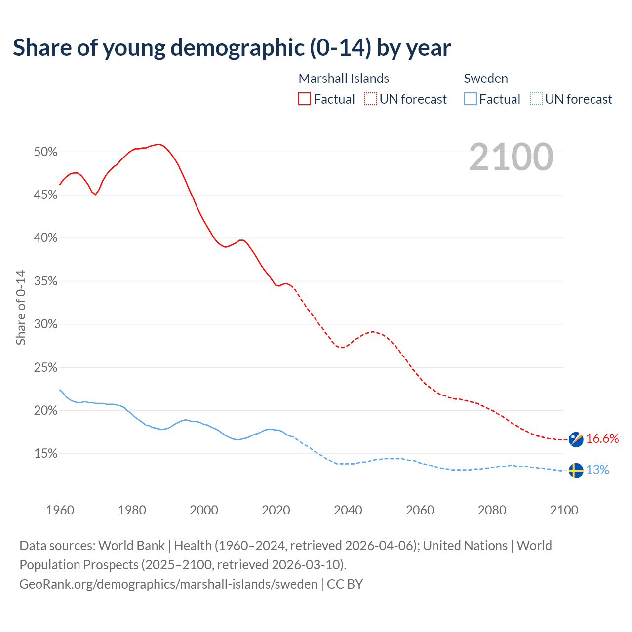 - The share of young demographic (0-15 years old) in the Marshall Islands is 34.5% vs 17% in Sweden.
