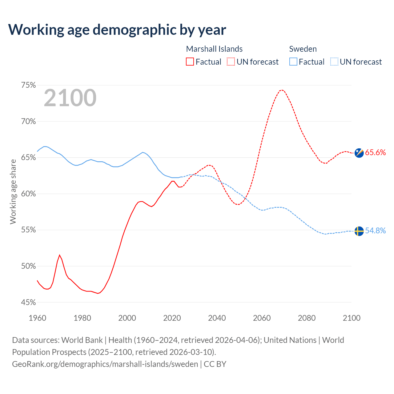 - The Marshall Islands has 21.3K working age adults (aged 15-64) vs 6.65M in Sweden.