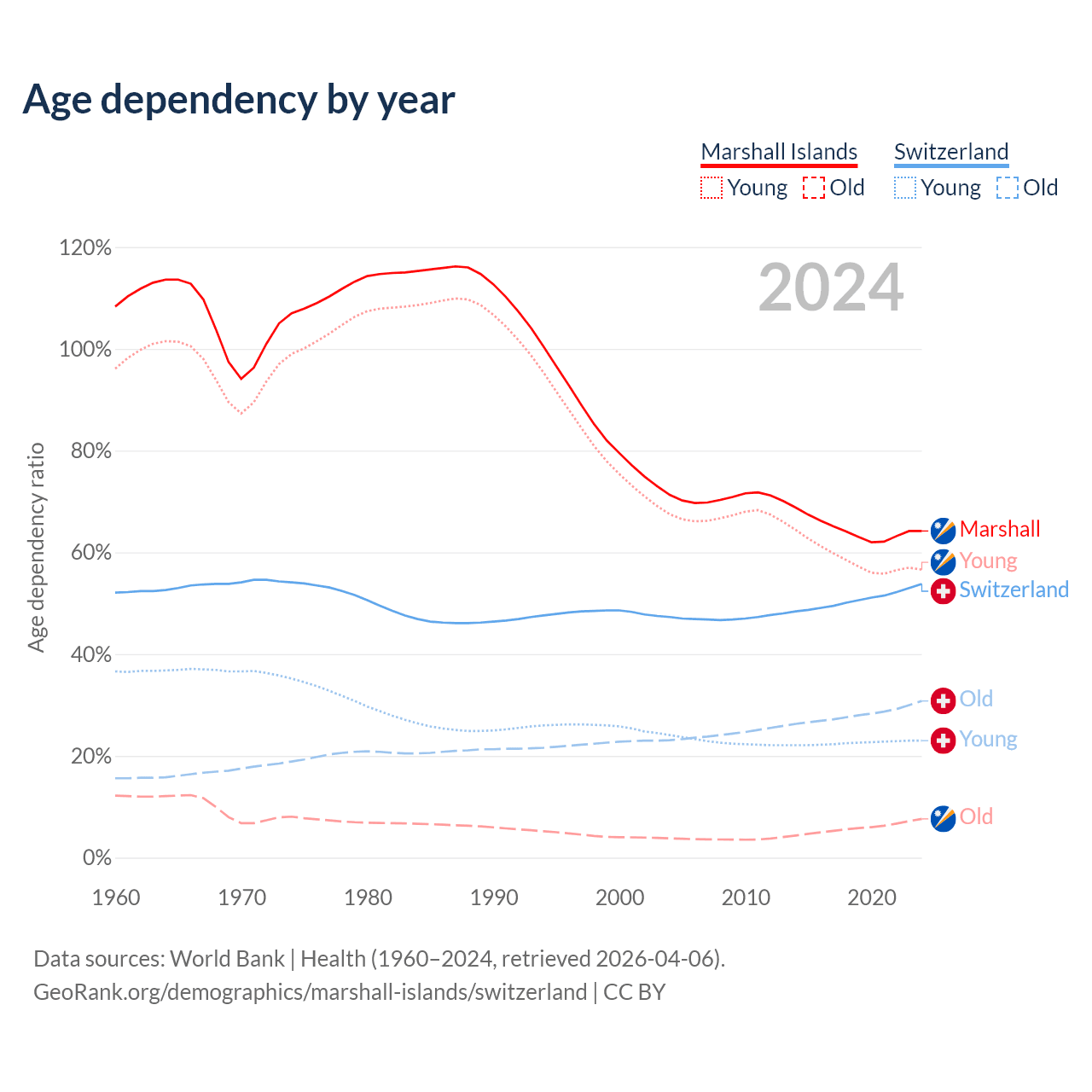 - The share of old-age demographic (65+) in the Marshall Islands is 4.64% vs 20% in Switzerland.