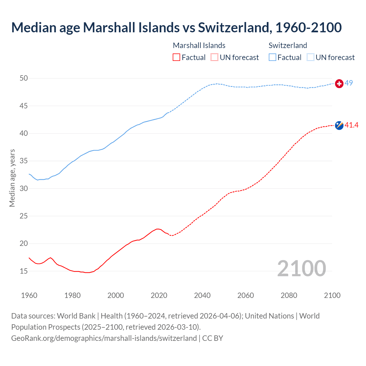 Median age Marshall Islands vs Switzerland, 1960-2100