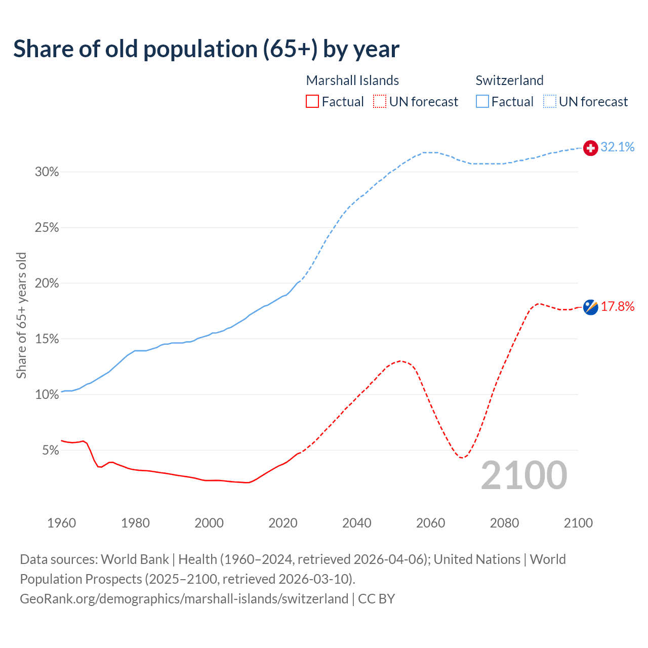 The share of older people aged 65 and over is 4.64% in the Marshall Islands and 20% in Switzerland. Life expectancy in the Marshall Islands compared to Switzerland .