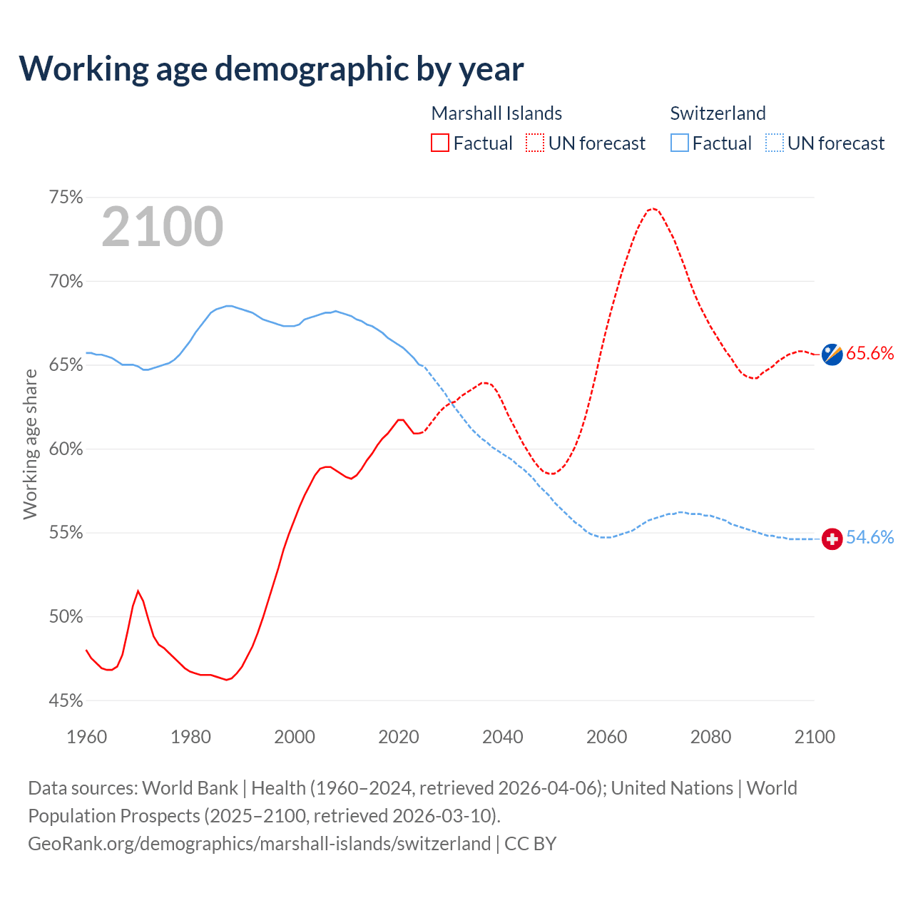 - The Marshall Islands has 21.3K working age adults (aged 15-64) vs 5.92M in Switzerland.