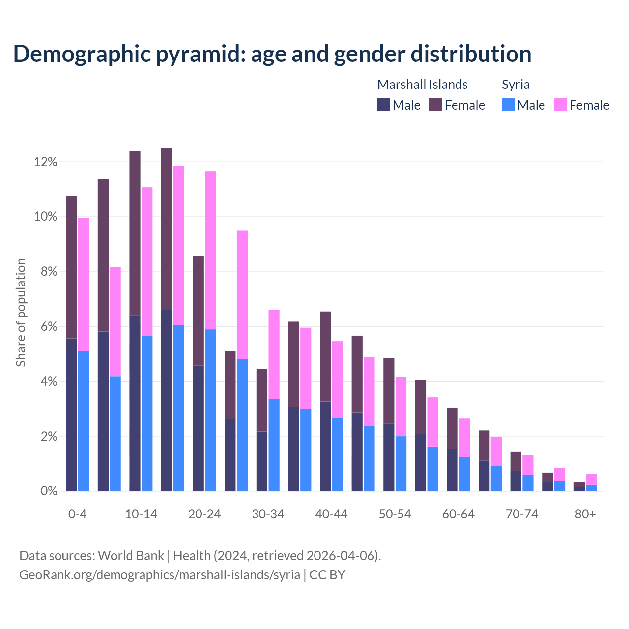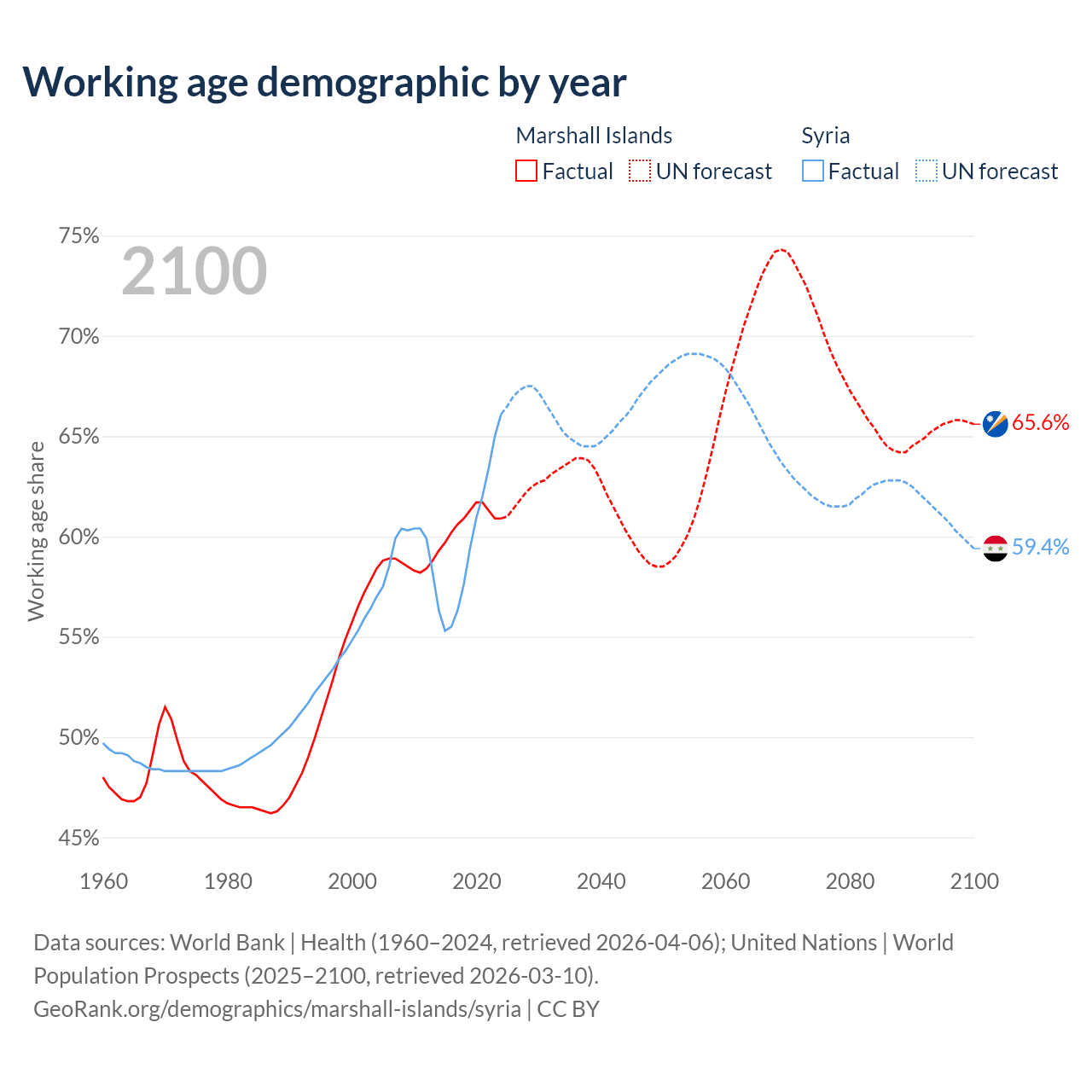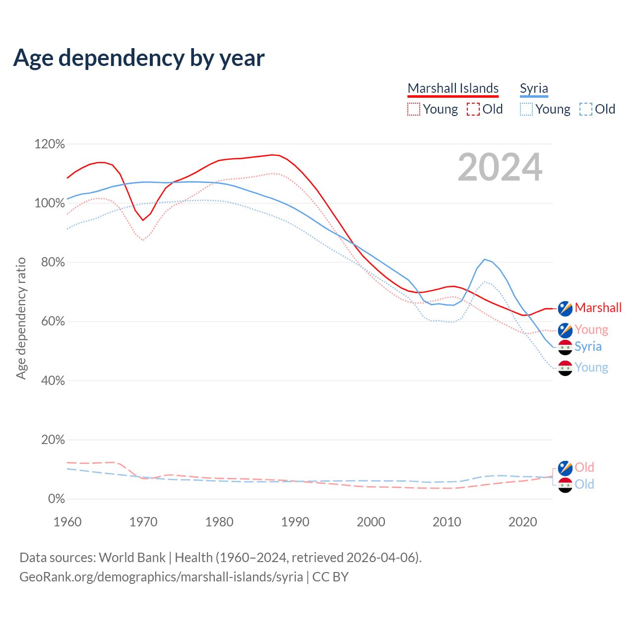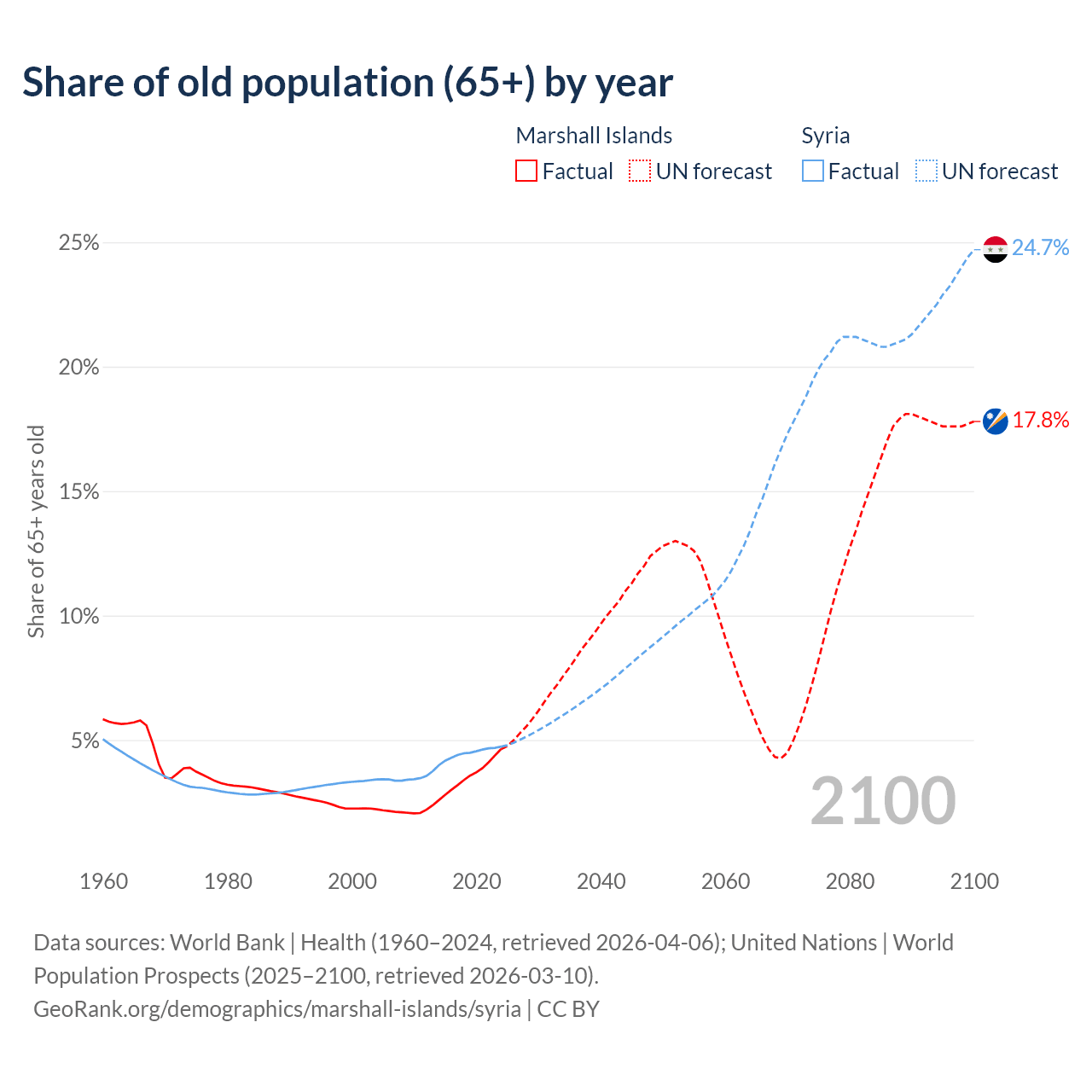 - The share of old-age demographic (65+) in the Marshall Islands is 4.64% vs 4.74% in Syria.