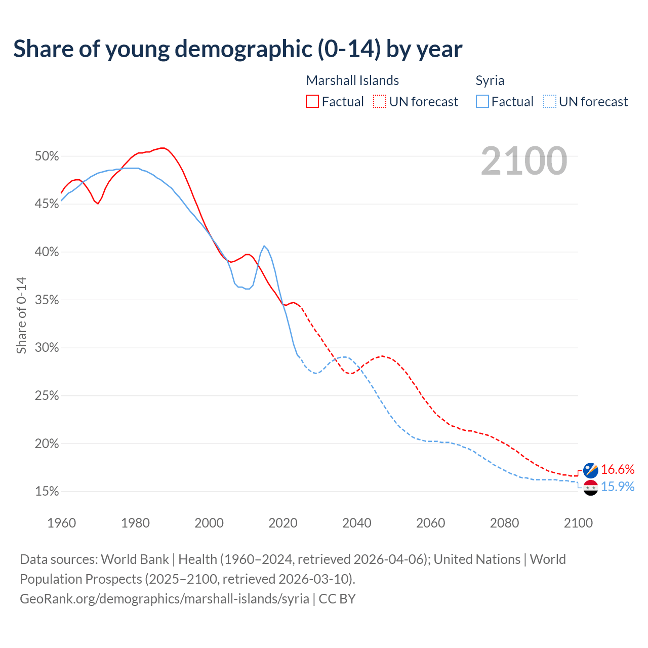 - The share of young demographic (0-15 years old) in the Marshall Islands is 34.5% vs 29.2% in Syria.