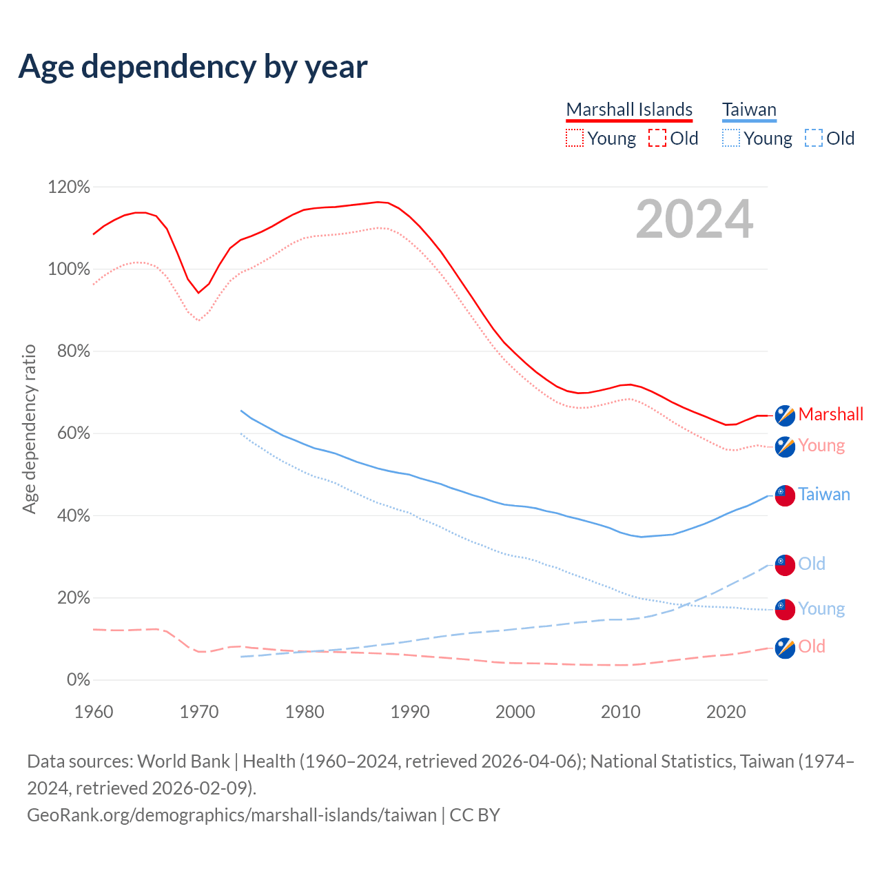 Data sources: World Bank | Health (1960–2024, retrieved 2026-04-06); U.S. Census Bureau (1960–2024, retrieved 2026-02-08); National Statistics, Taiwan (1974–2024, retrieved 2026-02-09).