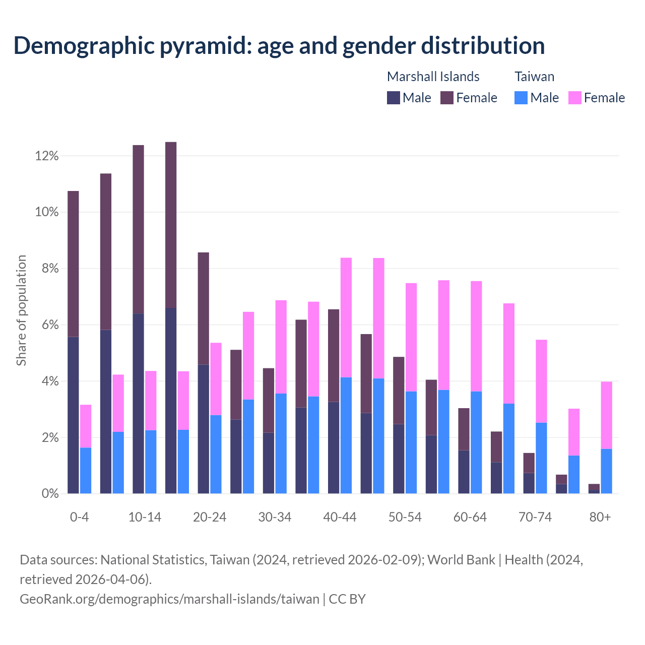 - The share of old-age demographic (65+) in the Marshall Islands is 4.64% vs 19.2% in Taiwan.