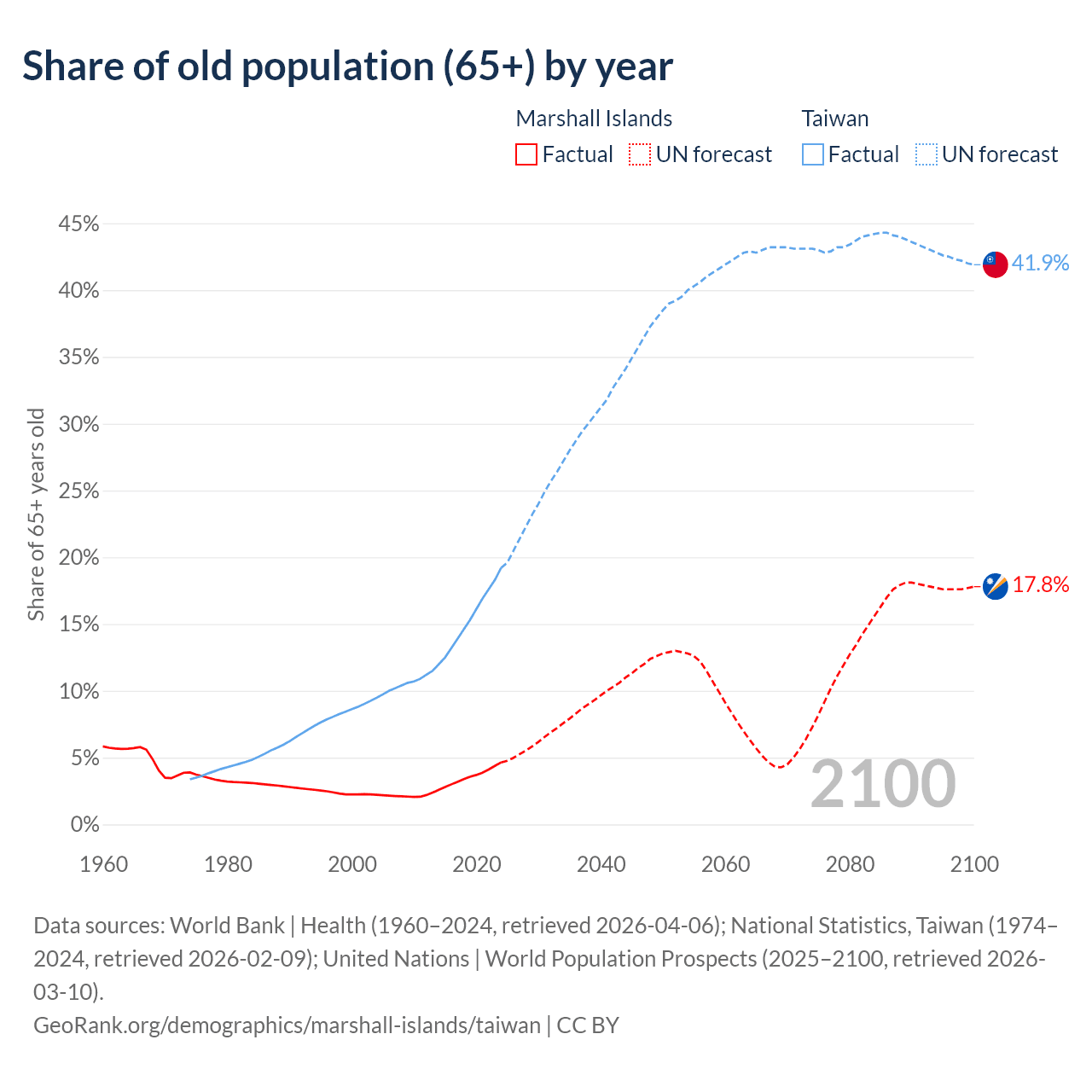The share of older people aged 65 and over is 4.64% in the Marshall Islands and 19.2% in Taiwan. Life expectancy in the Marshall Islands compared to Taiwan .