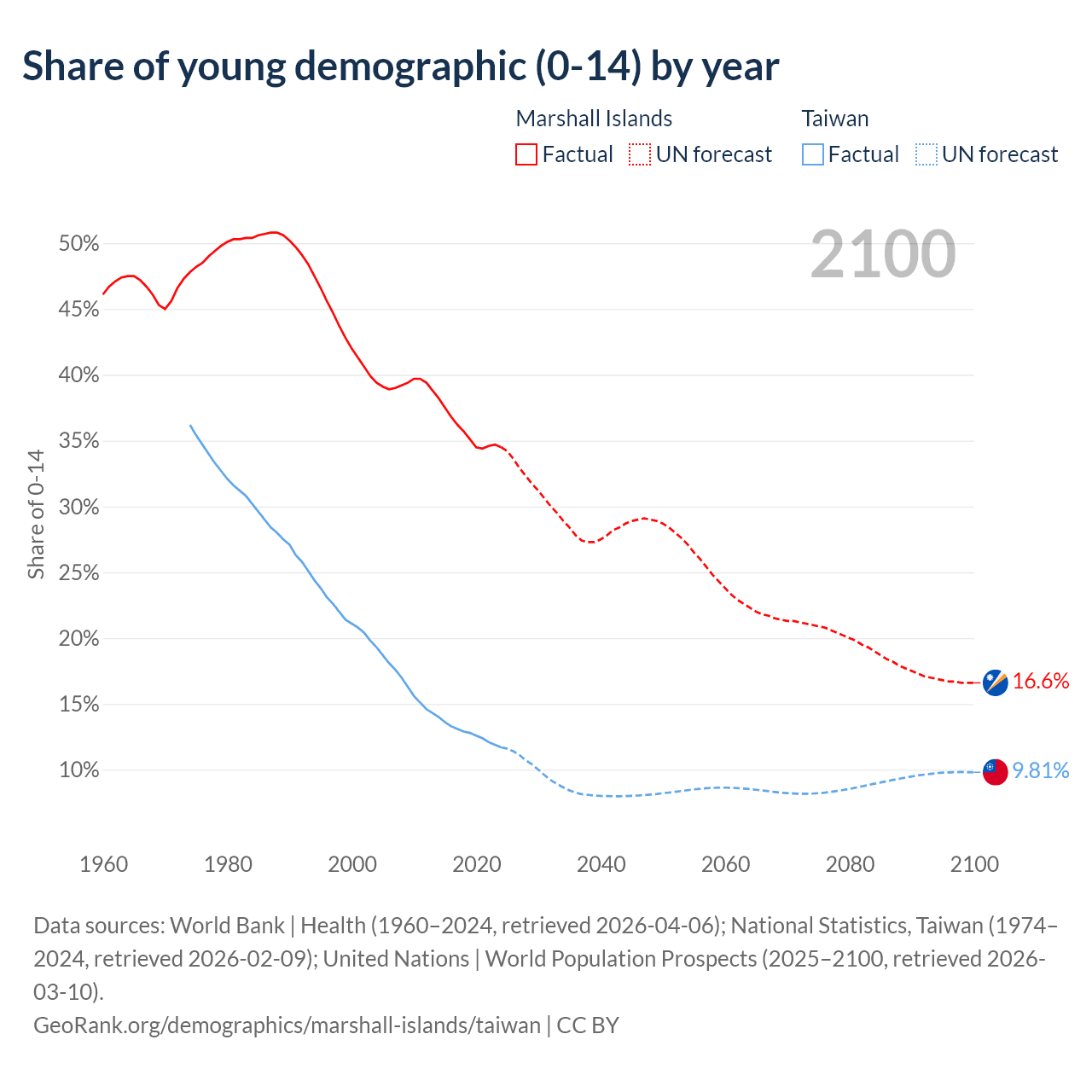 - The share of young demographic (0-15 years old) in the Marshall Islands is 34.5% vs 11.7% in Taiwan.
