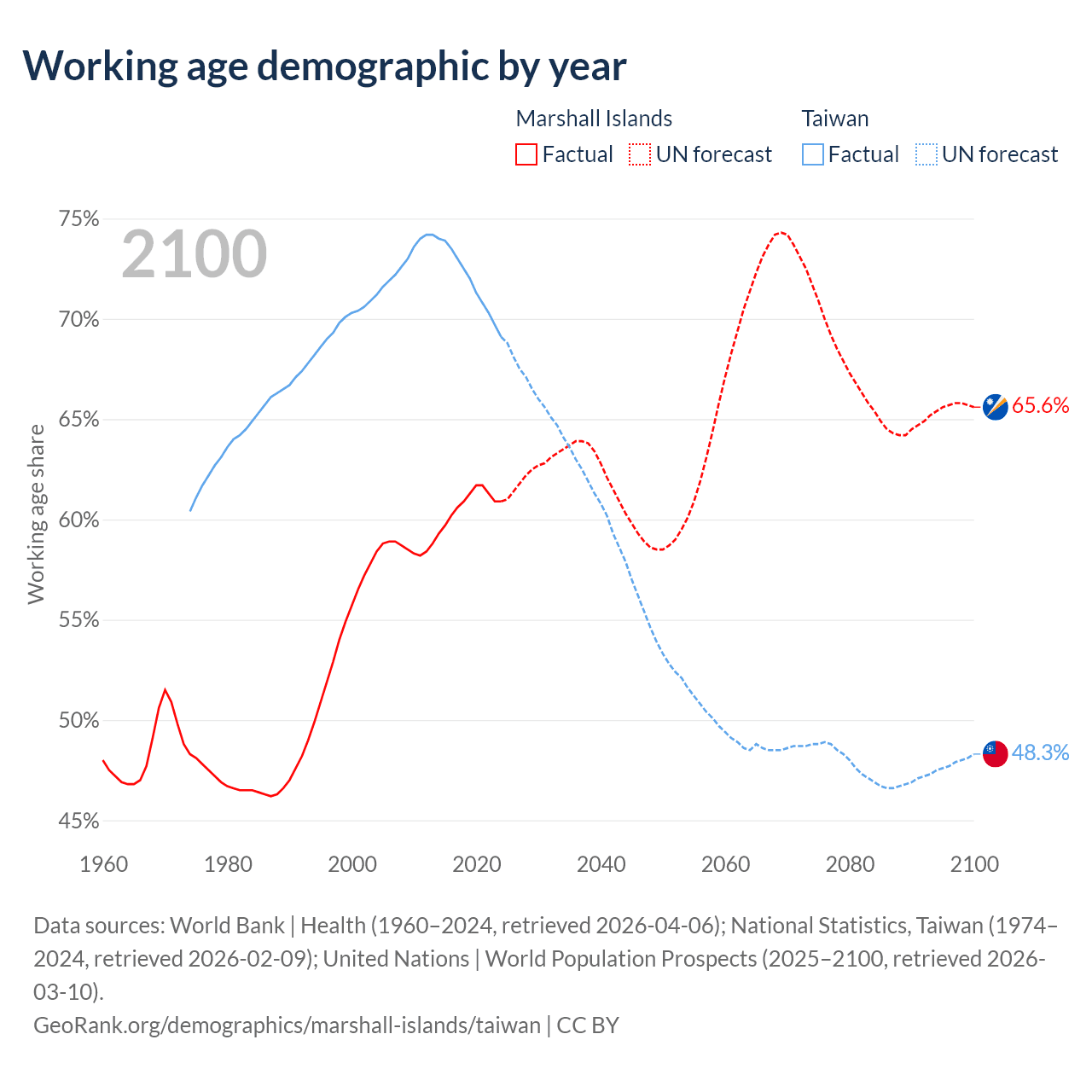 - The Marshall Islands has 21.3K working age adults (aged 15-64) vs 16.1M in Taiwan.