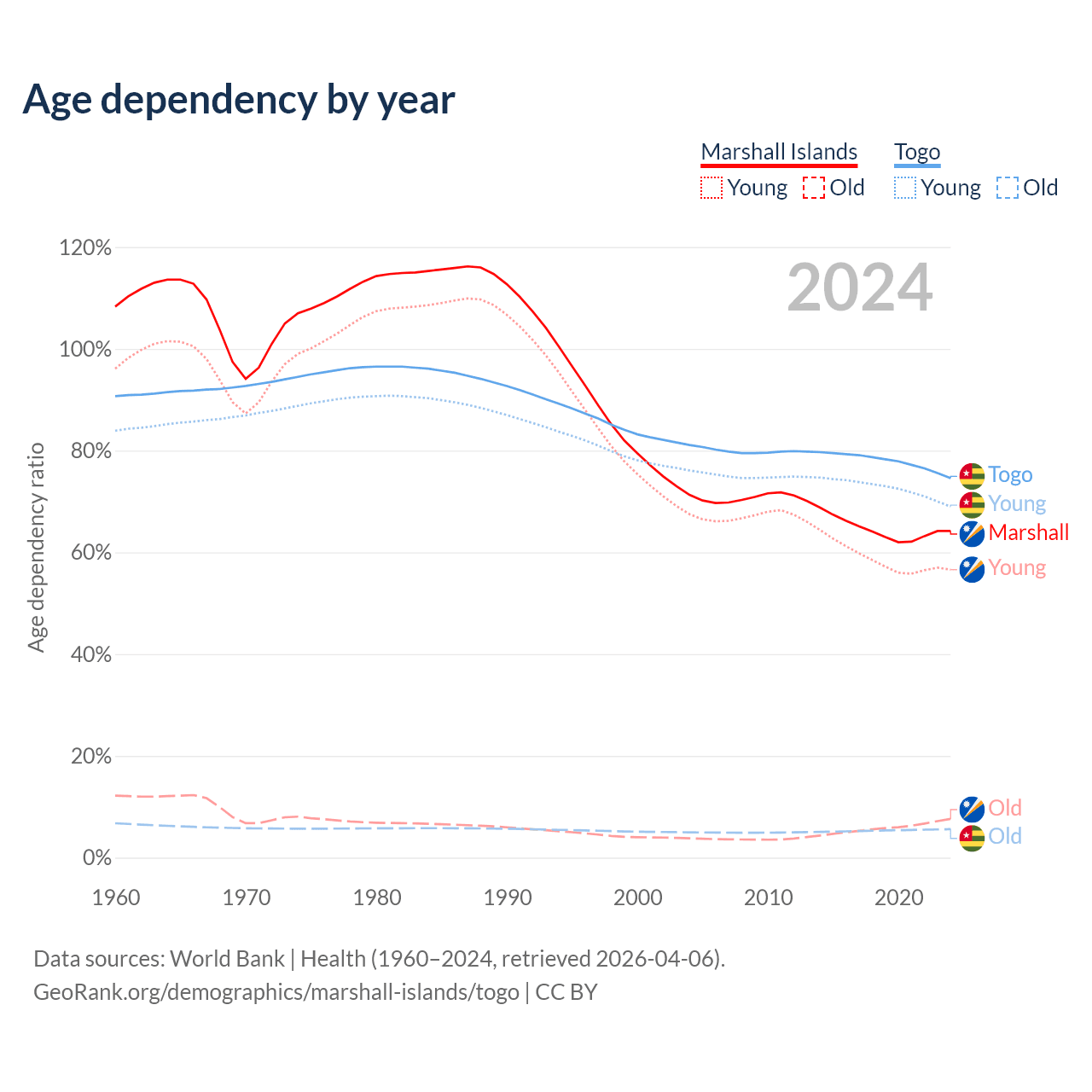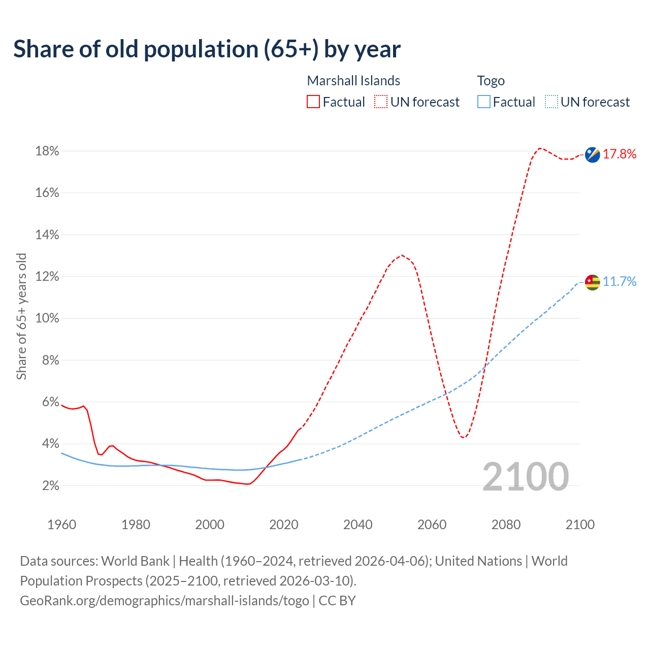 - The share of old-age demographic (65+) in the Marshall Islands is 4.64% vs 3.21% in Togo.