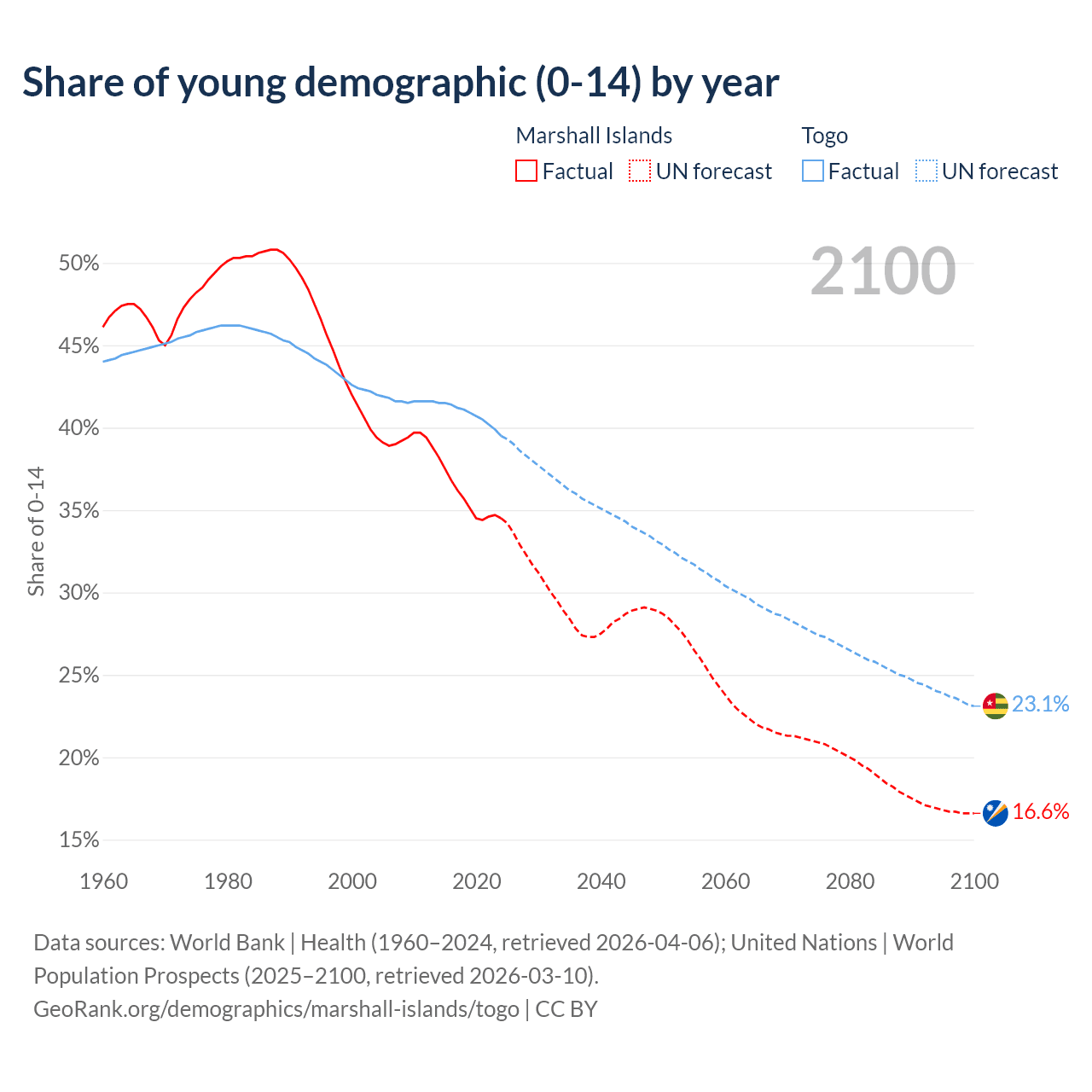 - The share of young demographic (0-15 years old) in the Marshall Islands is 34.5% vs 39.5% in Togo.