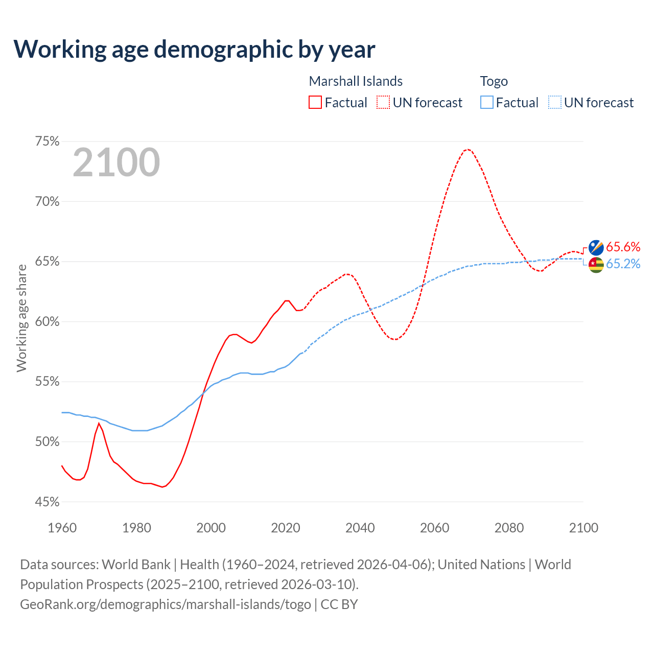 - The Marshall Islands has 21.3K working age adults (aged 15-64) vs 5.72M in Togo.