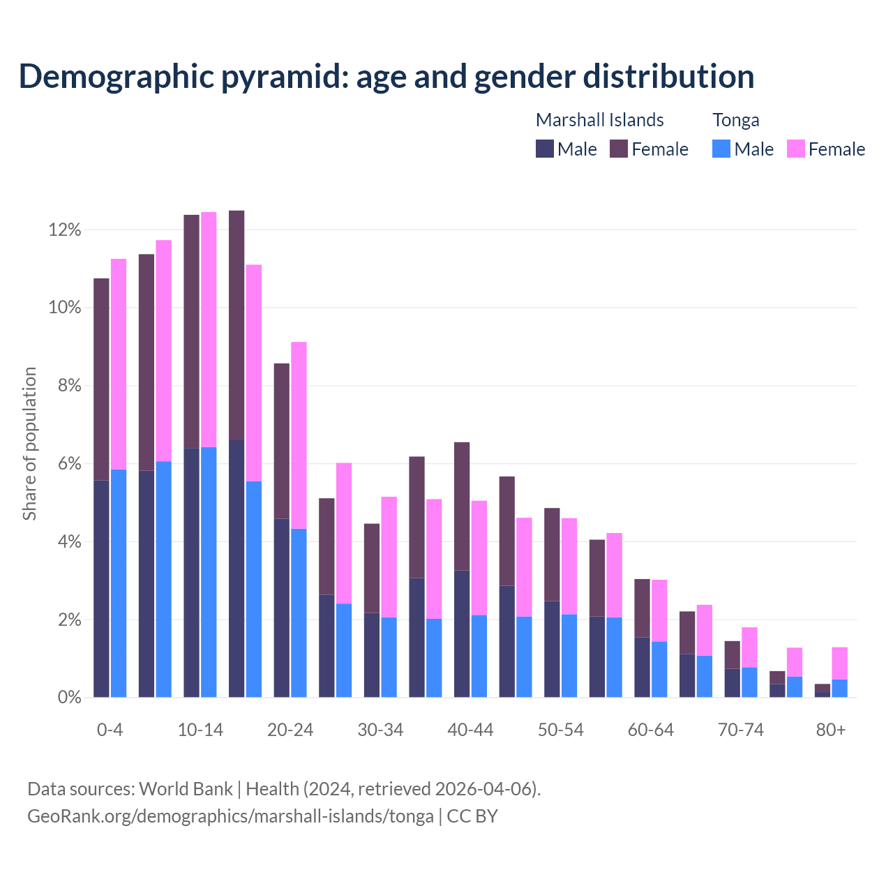 - As of 2026, the population of the Marshall Islands is 35.1K vs 103K in Tonga - 2.95 times difference.