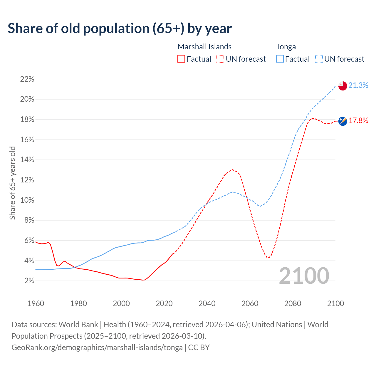 - The share of old-age demographic (65+) in the Marshall Islands is 4.64% vs 6.72% in Tonga.