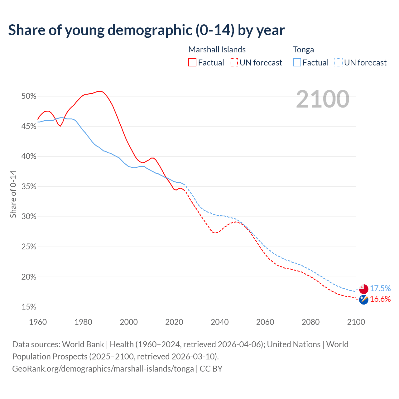 - The share of young demographic (0-15 years old) in the Marshall Islands is 34.5% vs 35.4% in Tonga.