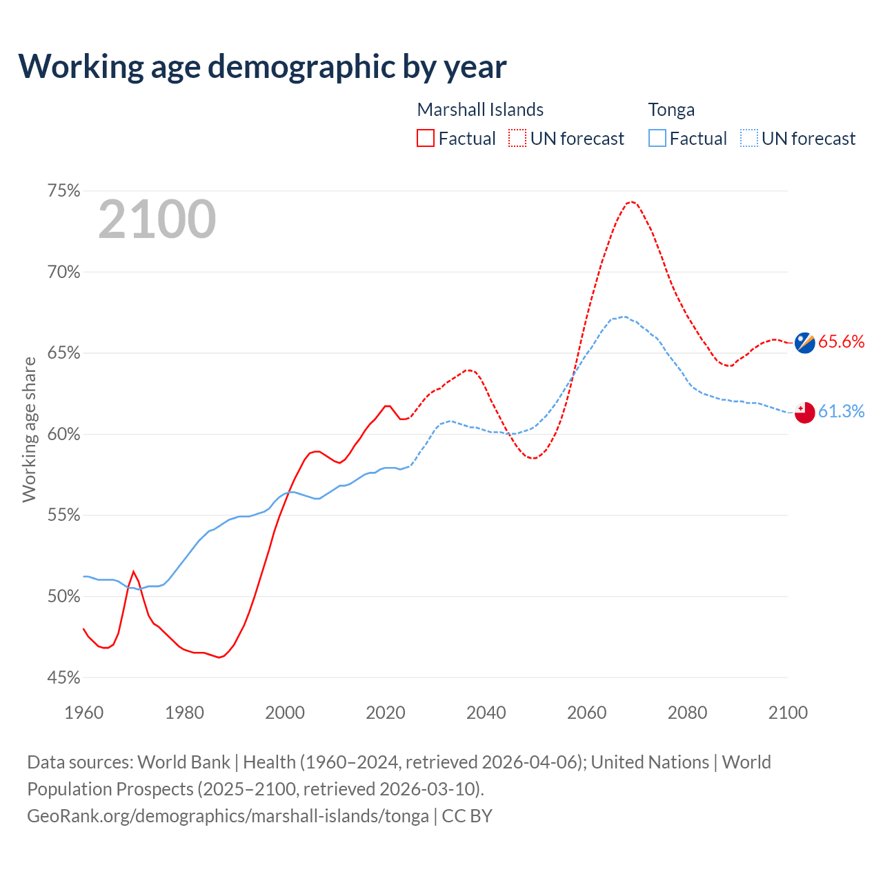 - The Marshall Islands has 21.3K working age adults (aged 15-64) vs 59.8K in Tonga.