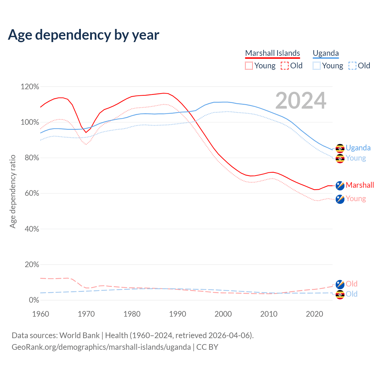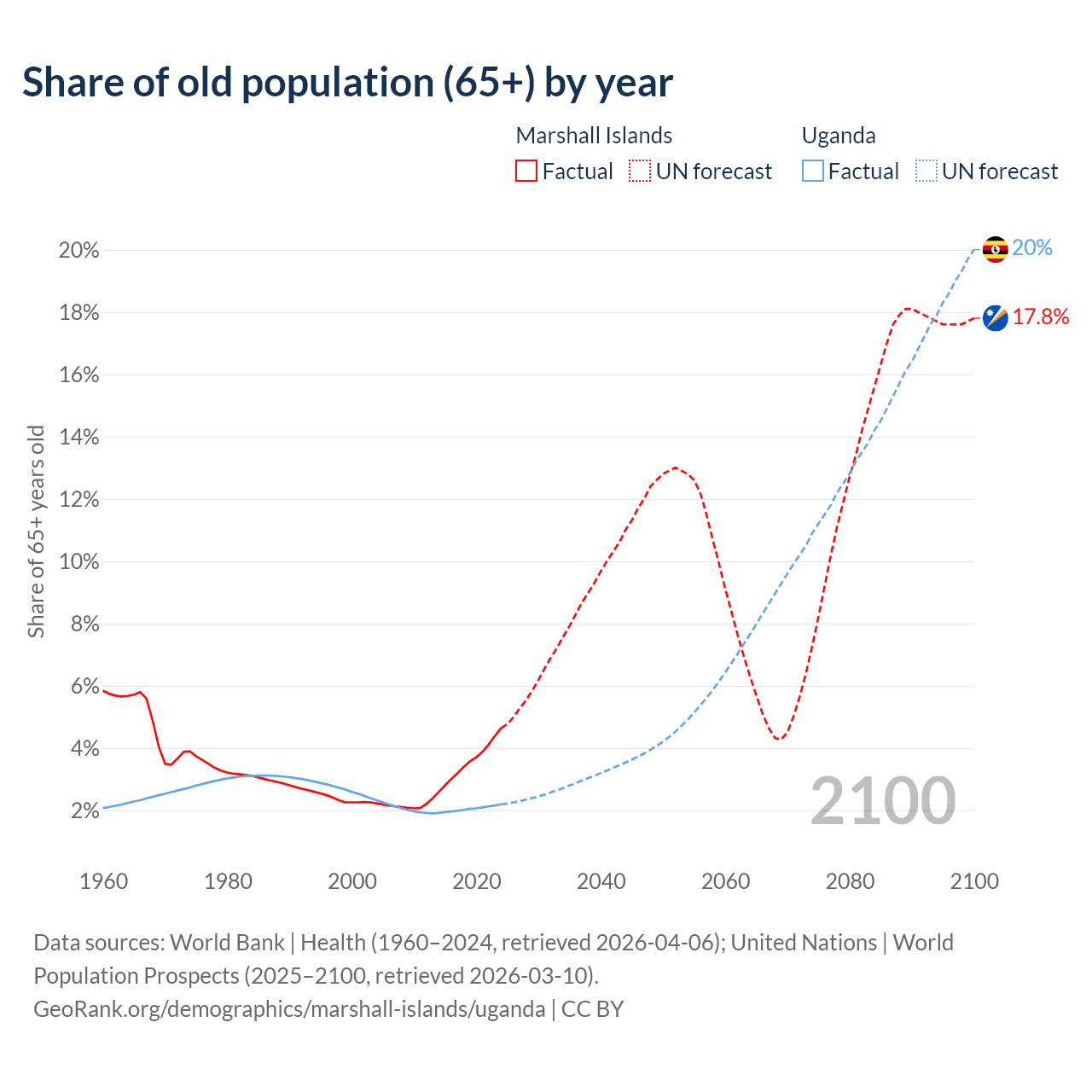 - The share of old-age demographic (65+) in the Marshall Islands is 4.64% vs 2.19% in Uganda.